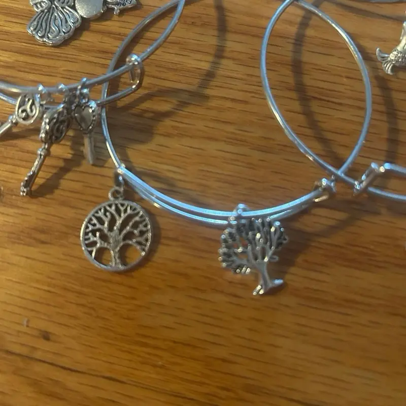 • Handcrafted bangles featuring a variety of random charms. Each set includes