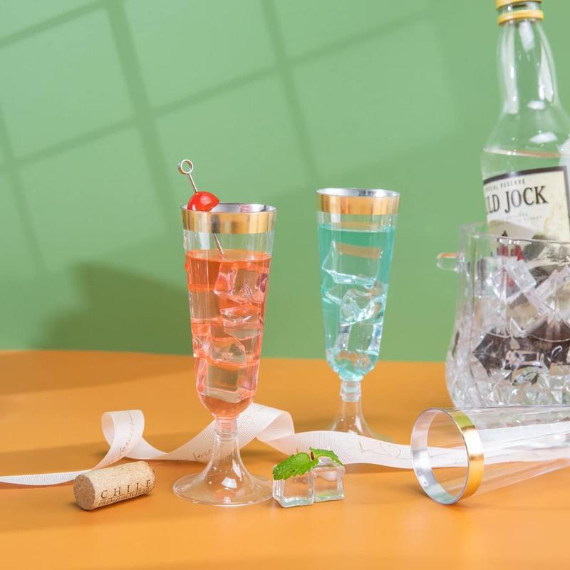 50 Gold Rim Plastic Champagne Flutes Set: 50pcs 5 oz fancy champagne glasses for all occasions