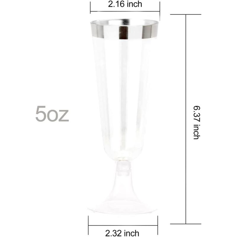 50 Silver Rim Plastic Champagne Flutes Set: 50pcs 5 oz fancy champagne glasses for all occasions