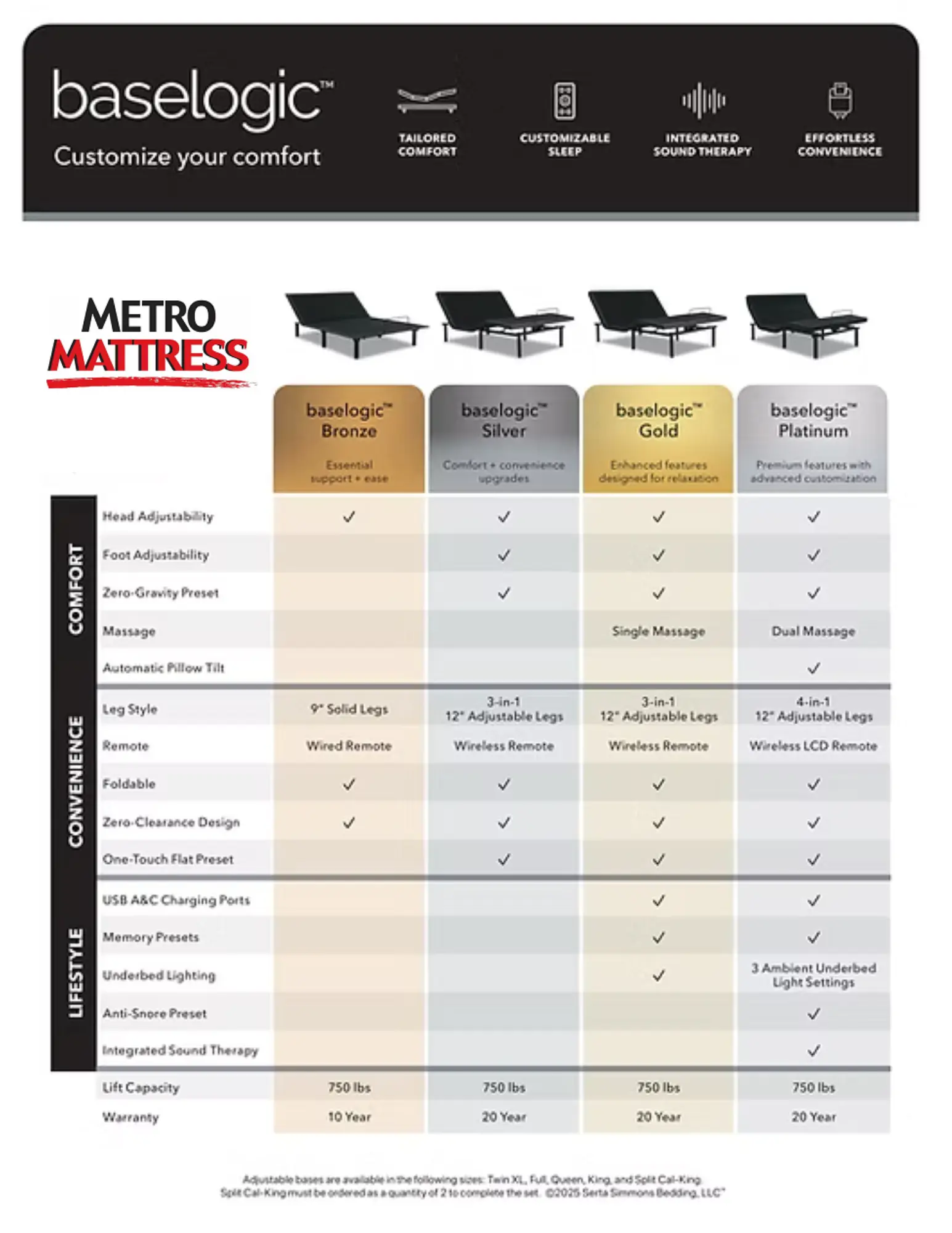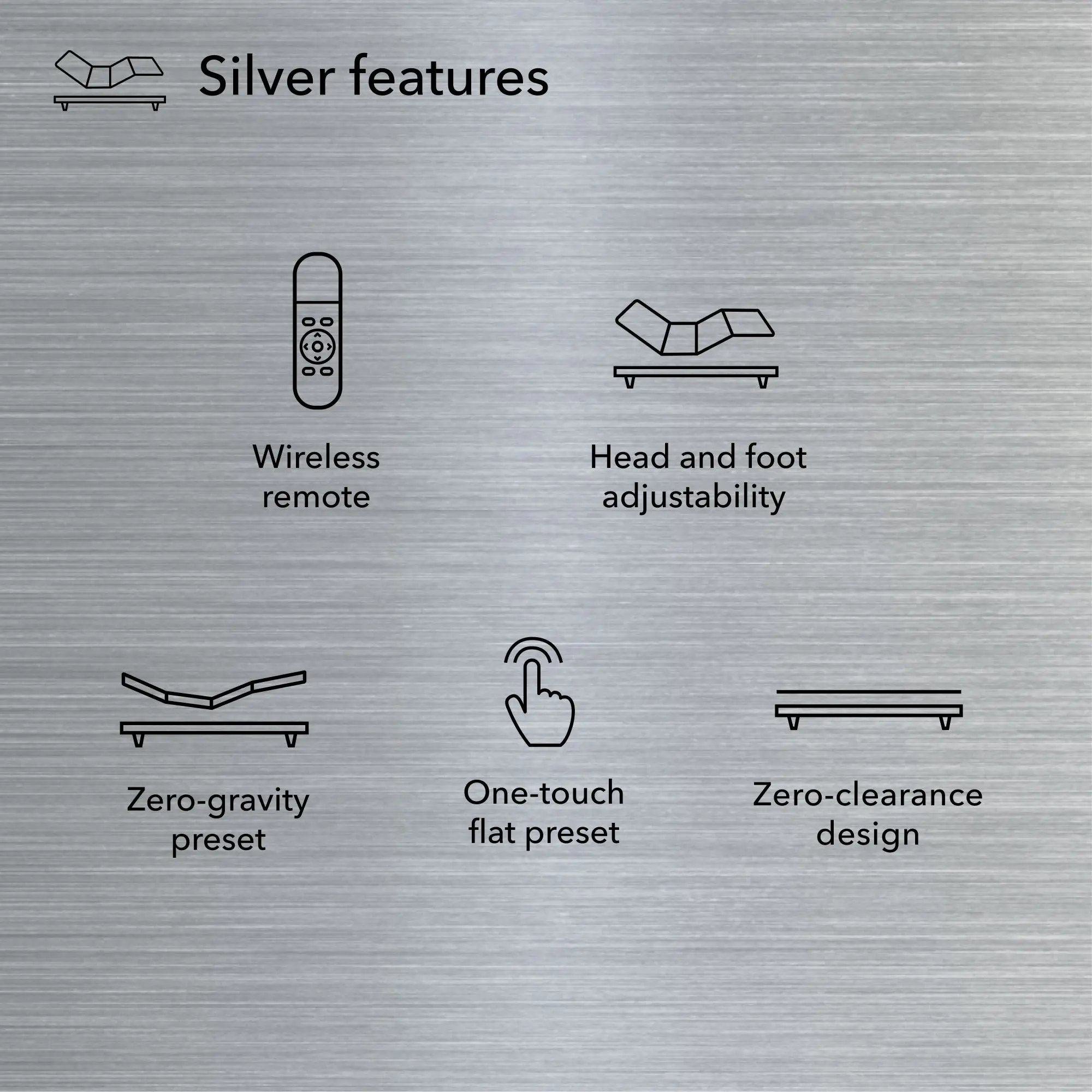 Experience the ultimate in sleep customization with the BaseLogic Silver Adjustable Base, engineered by the trusted makers of Serta and Beautyrest. This intelligent foundation offers infinite positioning options—raise your head for superior back support, elevate your legs to alleviate pressure and improve circulation, or adjust to your ideal angle for sleeping, reading, or working. Intuitive button controls deliver smooth, whisper-quiet adjustments, while the sleek silver design complements any bedroom aesthetic. Transform your mattress into a personalized comfort system that adapts to your body's needs throughout the day and night. Mattress sold separately.