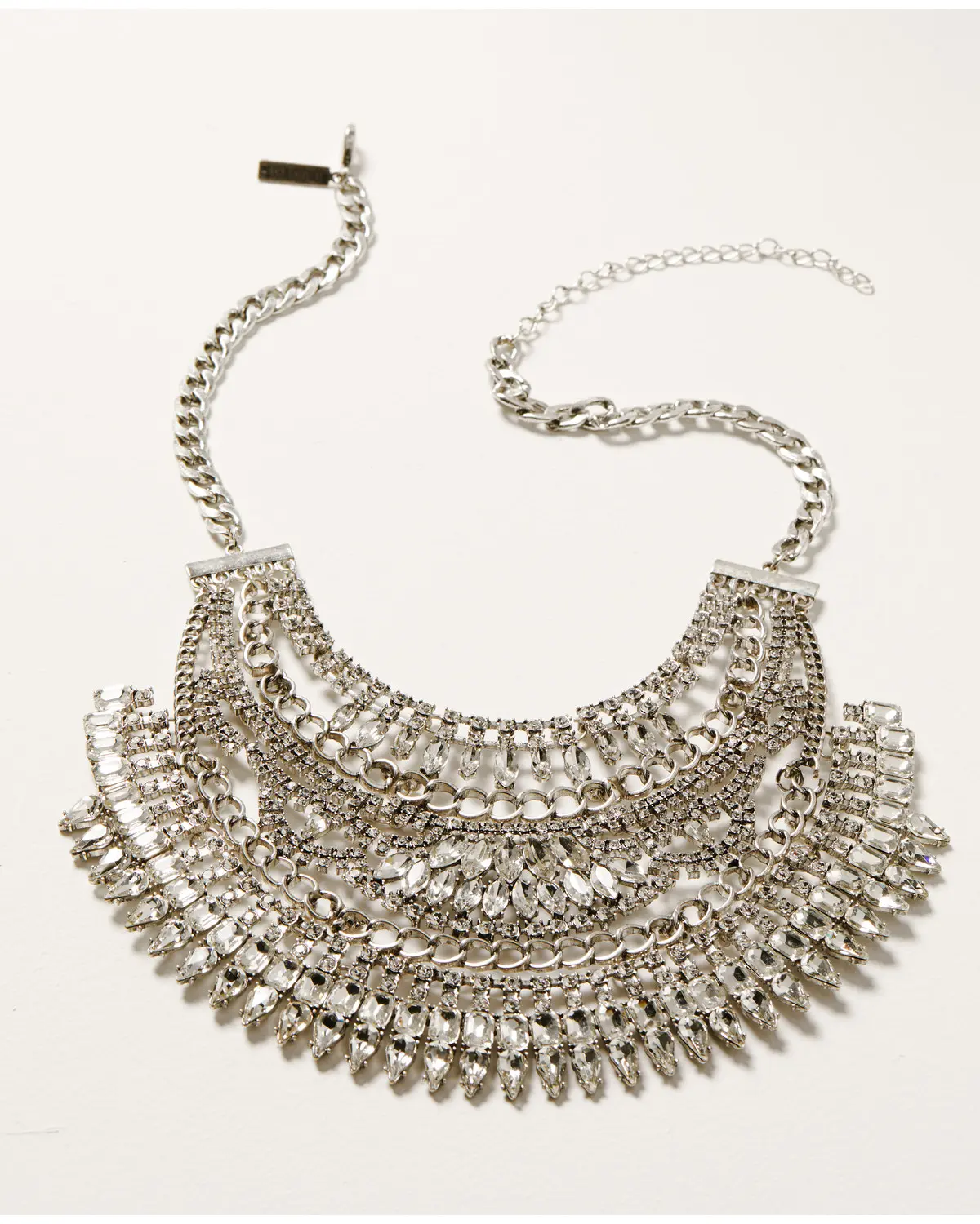 Statement necklace style. Multilayered bib design. Multi-shaped dangling stones. Two link chain layers. Thick curb chain. Silver. One size fits most.