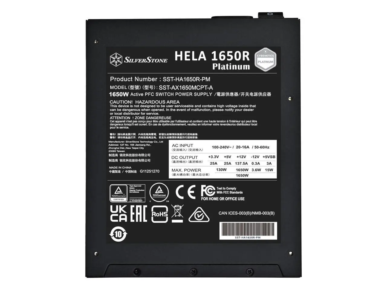 The HELA 1650R Platinum is a Cybenetics Platinum efficiency certified ATX (PS2) unit, boasting a relatively compact 180mm total depth. Its fully modular design utilizes SilverStone's 3rd generation modular interface, featuring a notable and innovative characteristica unified EPS/PCIe connector setup. This design streamlines cable management and facilitates easy installation. The power supply is capable of delivering a maximum wattage of 1650W, with 1200W obtainable through its dual 12+4 pin 12V-2x6 connectors. To ensure efficient cooling, the HELA 1650R Platinum is equipped with a 140mm Fluid Dynamic Bearing (FDB) fan. Its also incorporated with a delayed shutoff function that allows the cooling fan to run for a short period of time after shutdown, while also providing protection of system from power surges or fluctuations that may occur during system shutdown helping improve system reliability, protection from component damages and prolonging of its lifespan.
