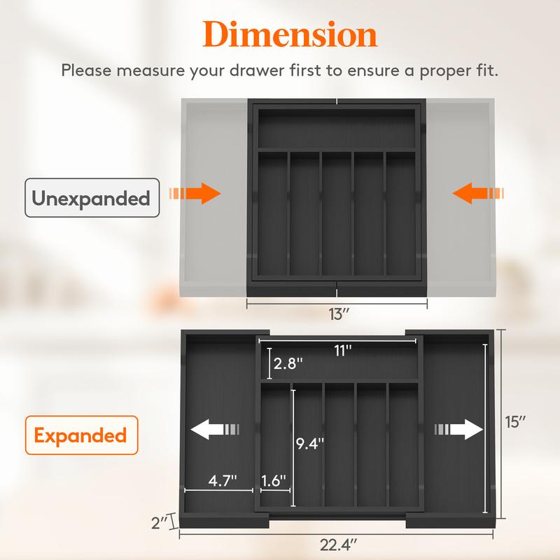 This kitchen drawer organizer features 6 fixed compartments and 2 expandable sides, offering ample storage and customizable space. It adjusts to fit drawers between 13" and 22.4" wide, making it perfect for maximizing storage efficiency.