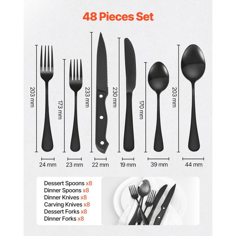 • 48-Piece Flatware Set: This silverware set includes 8 dinner forks, 8 dinner spoons, 8 dinner knives, 8 dessert forks, 8 dessert spoons, and 8 carving knives, making it an essential item for both home and restaurant use. Whether for everyday meals, dinner preparation, or parties, this flatware set is an indispensable dining tool