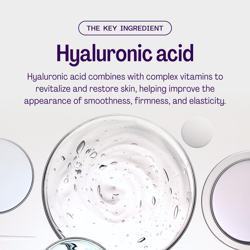 This powerful formula combines hyaluronic acid with essential vitamins B3, B5, B6, C & E. Together, it provides deep hydration to visibly reduce fine lines and wrinkles, while also promoting the appearance of firmer skin.