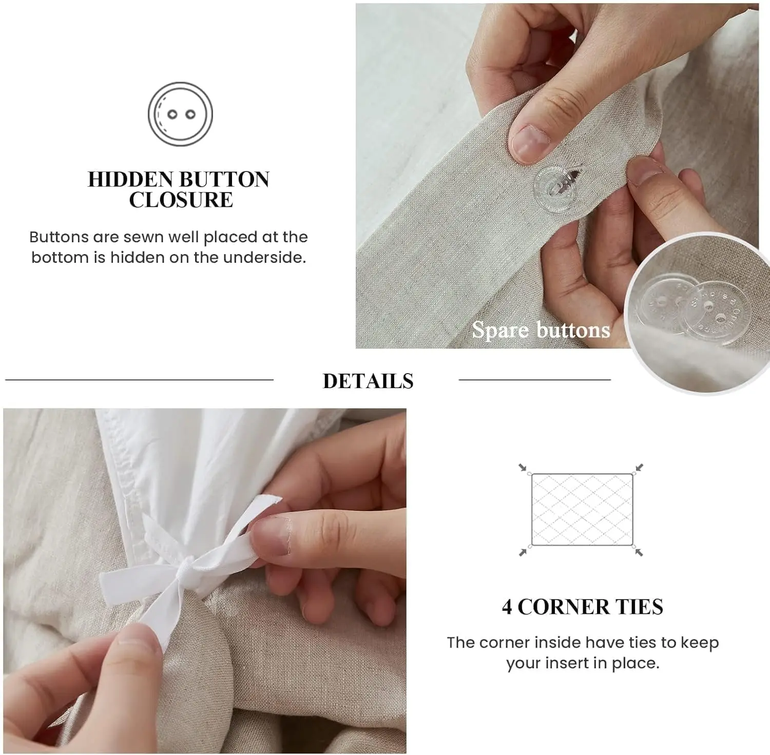 ·Thoughtful Details: 4 inner corner straps and hidden button closure ensure a secure fit to prevent the filling from bunching up. The linen bedding set comes with 2 extra spare buttons, no need to worry about unexpected inconvenience.