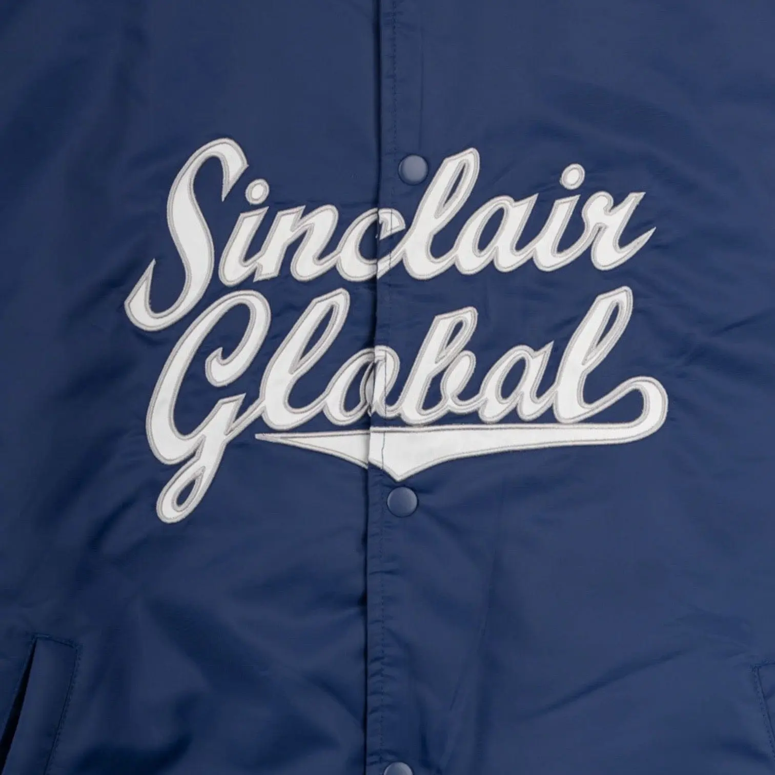 Sinclair Script Logo Satin Varsity Jacket Blue White