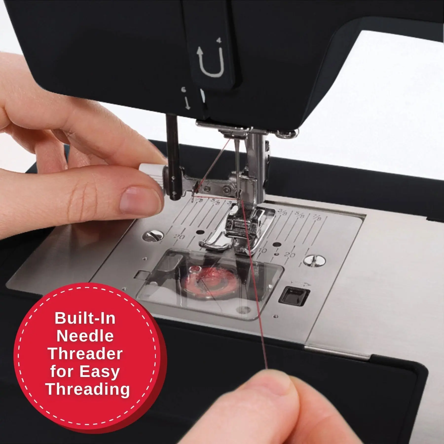 This is not a very user friendly sewing machine. You can't even get the plastic cover off of the bobbin case without manually pushing up the presser foot as far as it goes because there's not enough space to get the plastic cover out with maybe breaking it. Also, you have to take off four screws before you can remove the bobbin case to clean up lint which I like to do frequently. Also, it comes with very few accessories. I searched to buy a zipper foot to go with the machine and I still haven't found it. I needed the zipper foot to sew my flanged edges on my pillows, because if I use the regular presser foot that came with the machine when sewing the flanged edge it just knocks the presser foot off. So I had to give up making my flanged edges. I'm going to return the machine, I don't think it's a very good quality like Singer used to be 🙁. Makes me sad because I have used Singer all my life. The sewing repair guy said it's not really a heavy duty machine, that all they did was increase the speed.