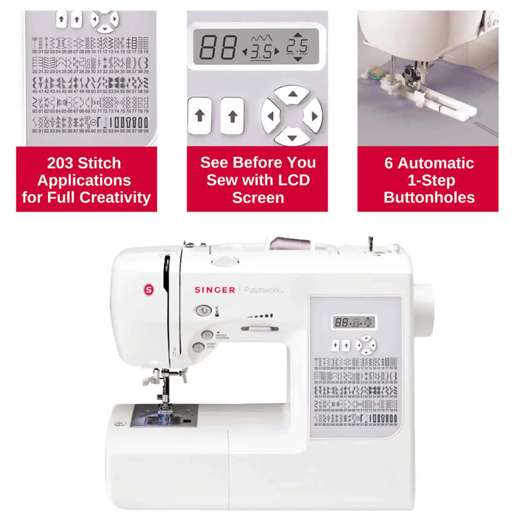 My new Singer Patchwork machine is great. There are a couple of things that are a little tricky. The button you push for a backstitch is not real responsive and it slows me down. I like the presets for stitches, keeps everything solid. I recently saw the Singer Patchwork Plus machine. I kind of wish I had found it first when shopping for the Singer. This machine is going to be for quilting as I’m just now getting back into sewing again. I’m happy with my purchase! No problems found. If I keep up on changing needles and presser feet for different jobs the machine works very well!