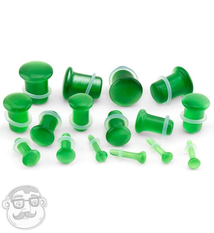 Green cat’s eye glass single flare plugs in any of the following sizes: 8 gauge (3mm), 6 gauge (4mm), 4 gauge (5mm), 2 gauge (6mm), 0 gauge (8mm), 00 gauge (10mm), 7/16" (11mm), 1/2 inch (12mm). Sold in pairs.
