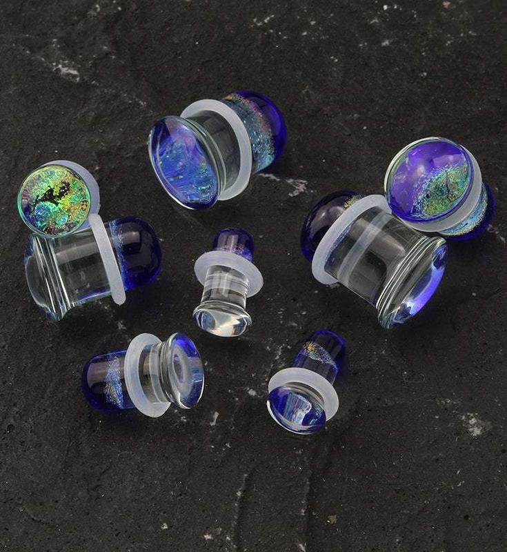 Mesmerizing dichroic glass plugs with a shimmering, blue, green, gold and pink rainbow shine that makes for a colorful pair to add to your plug collection! Single flares. Handcrafted and polished. Pick your size from 2G (6mm) - 1/2" (12mm). Full length is approximately 15mm. Comes with clear "O" rings. Sold in pairs (2pcs).