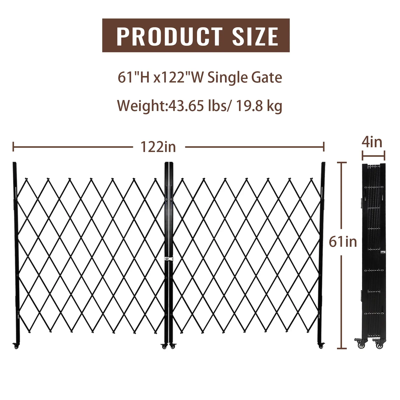·Flexible Sizing: Available in multiple sizes (50"H x 43"W, 50"H x 75"W, 61"H x 71"W, 61"H x 122"W, 85"H x 95"W, 85"H x 150"W), the gate adapts to various spaces, ensuring a perfect fit for doors, stairs, or wide openings.