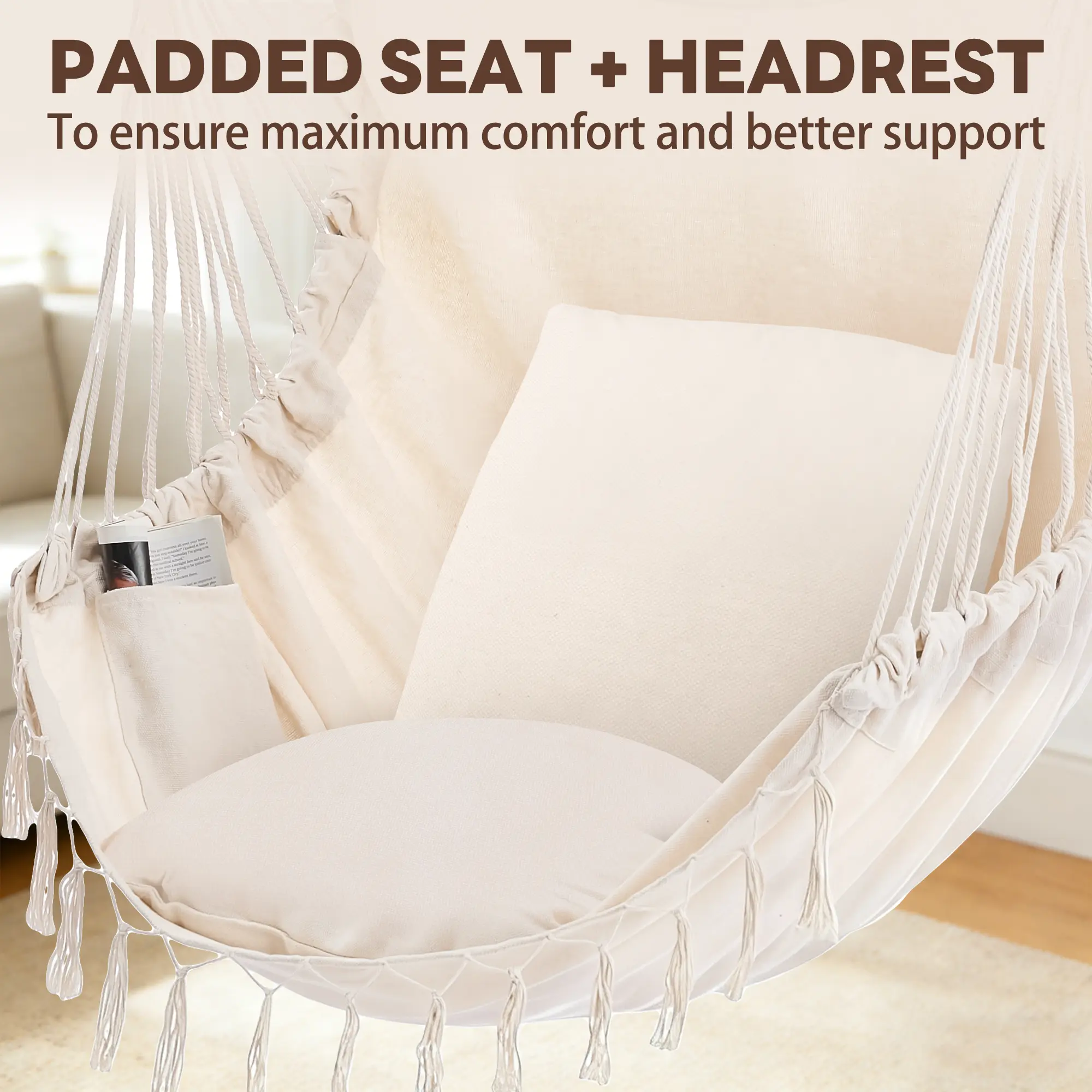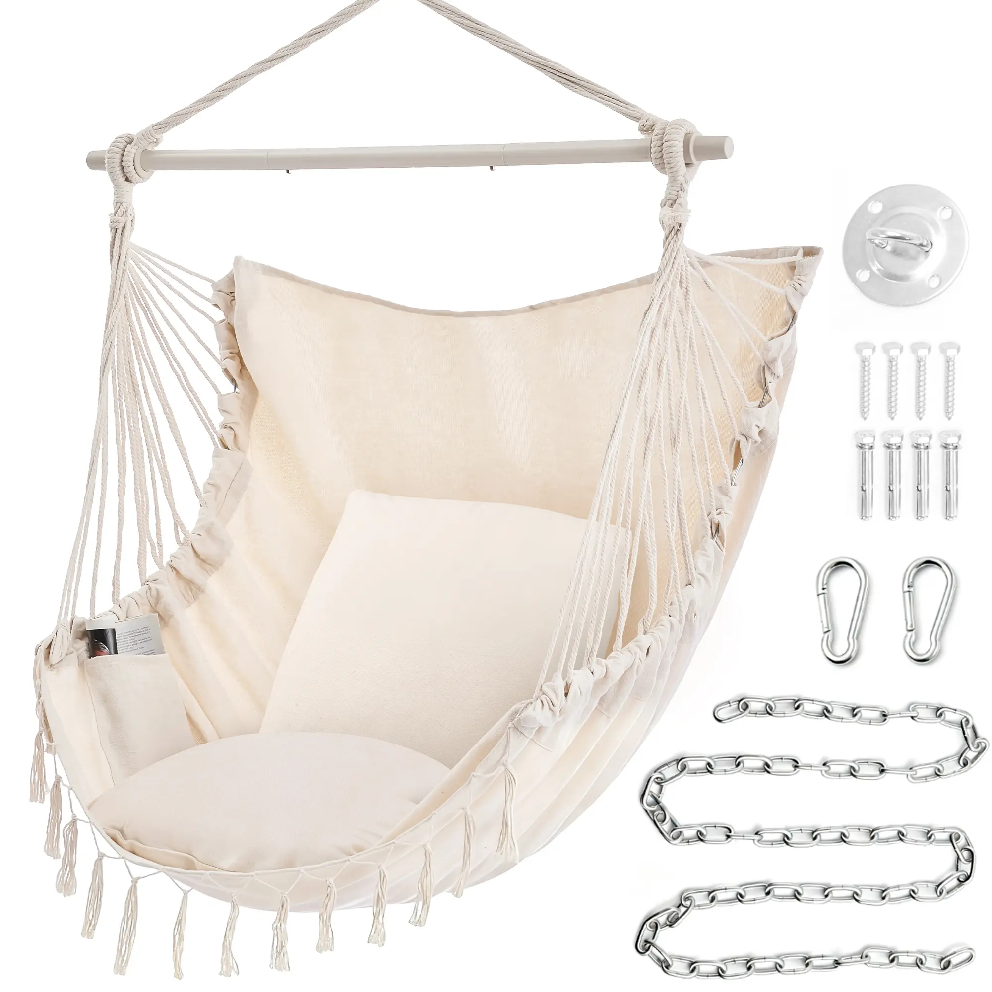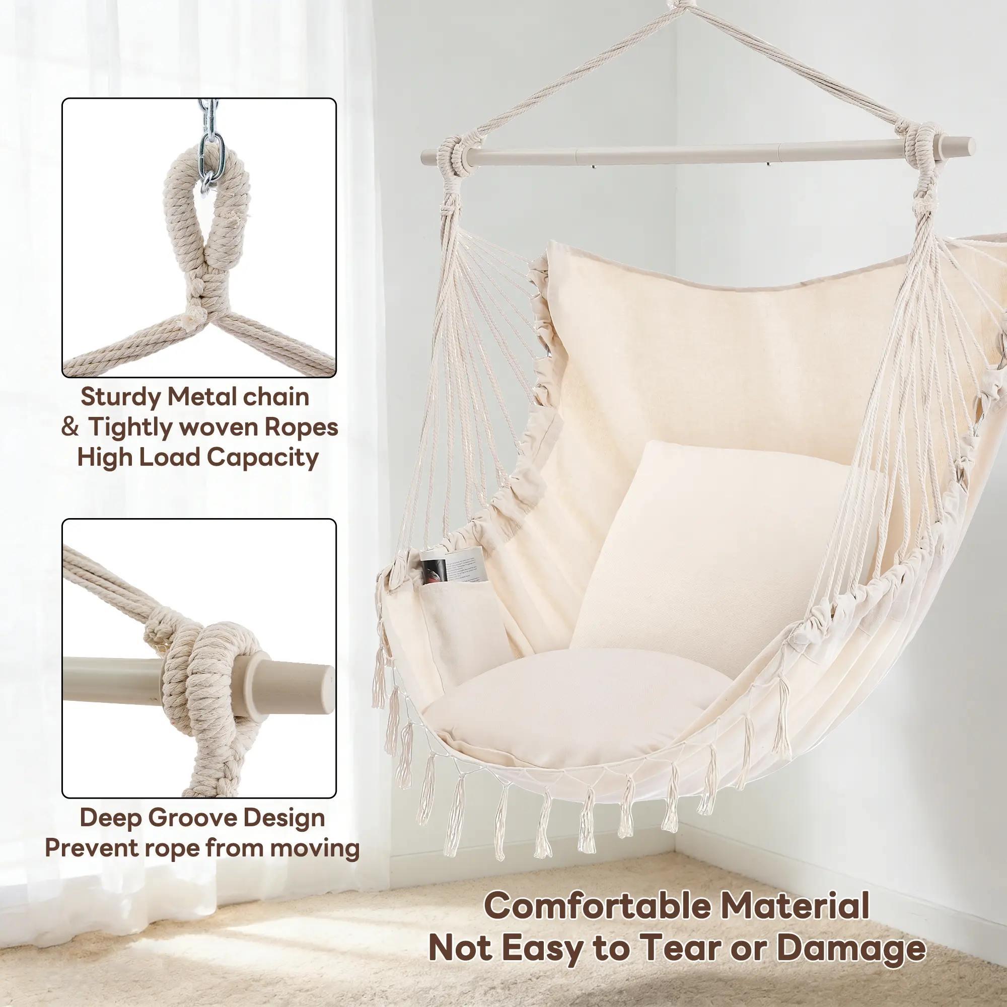 This hammock chair is made for cozy relaxation indoors or outdoors. Crafted with soft, durable fabric, it comes with a matching cushion pillow to enhance comfort as you lounge. The tassels bring a stylish, bohemian vibe to any space. Easy to use in areas like a bedroom, patio, or backyard, it provides a sturdy spot to read, unwind, or simply enjoy some quiet time. Its simple yet inviting design makes it a great addition for creating a relaxed corner at home.