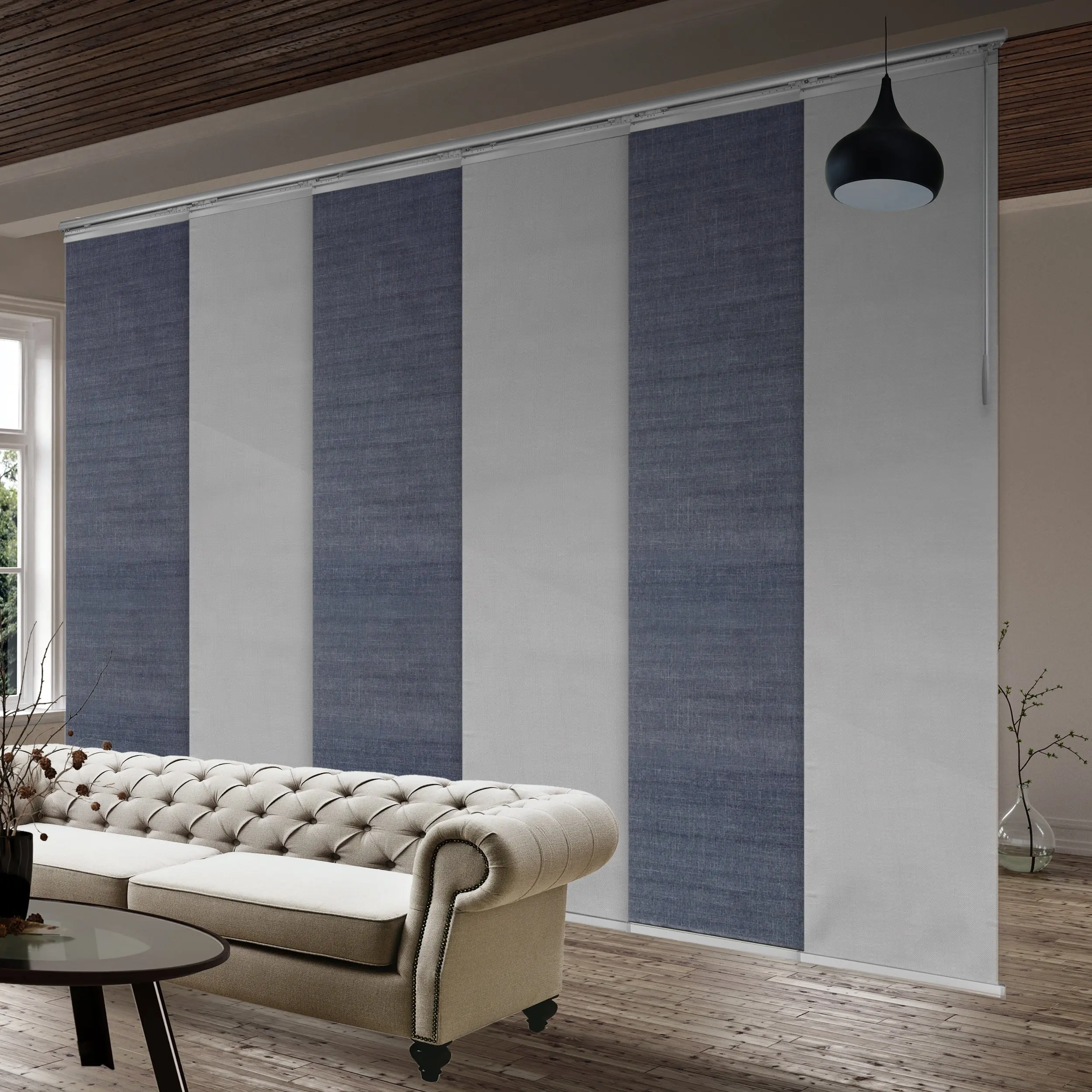 6-Panel Single Rail Panel Track Blind Extendable 70"-130"W x 91.4"H, Panel width 23.5", Spruce, Embroidered Cadet