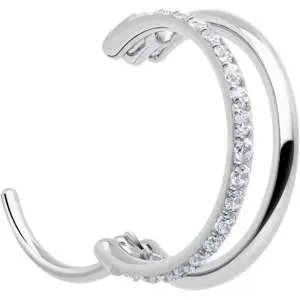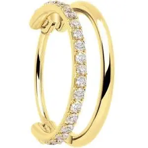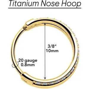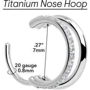 . Only one piercing is required for this double nose piercing ring. It is made with a ASTM F-136 titanium implant grade hinged circular ring. This hoop nose ring features one single row hoop paved with dazzling forward facing cubic zirconia gemstones for total glamour.