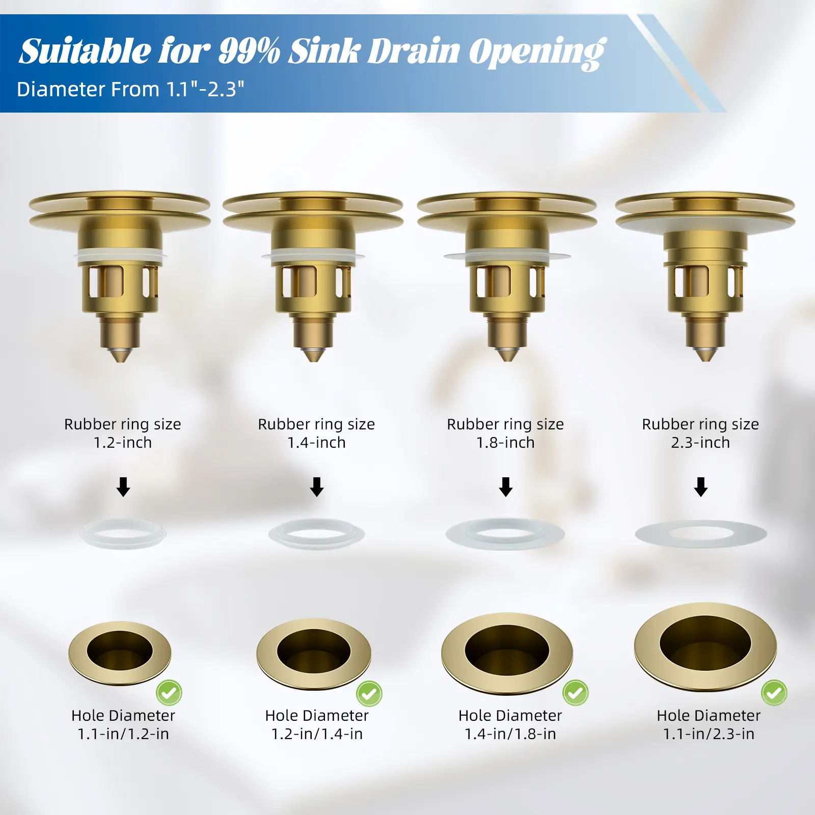 ·【Versatile Compatibility】 This bathroom sink drain stopper is designed to fit 99% of standard US sink drains, including bathroom sinks and washbasins with drain holes ranging from 1.1" to 2.3". Please measure your sink drain hole opening before purchasing to ensure a proper fit. The package also includes four O-rings while others only include 2. Which can ensure a perfect fit for various drain openings. Note: This stopper is not suitable for bathtub drains