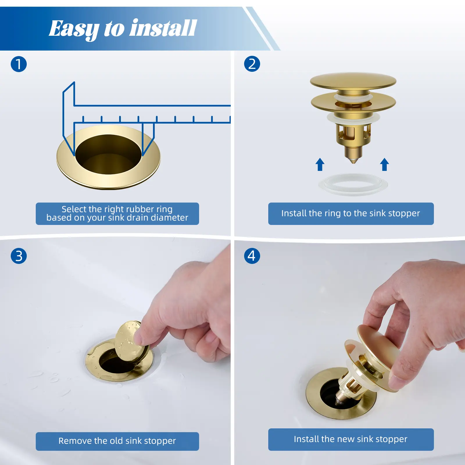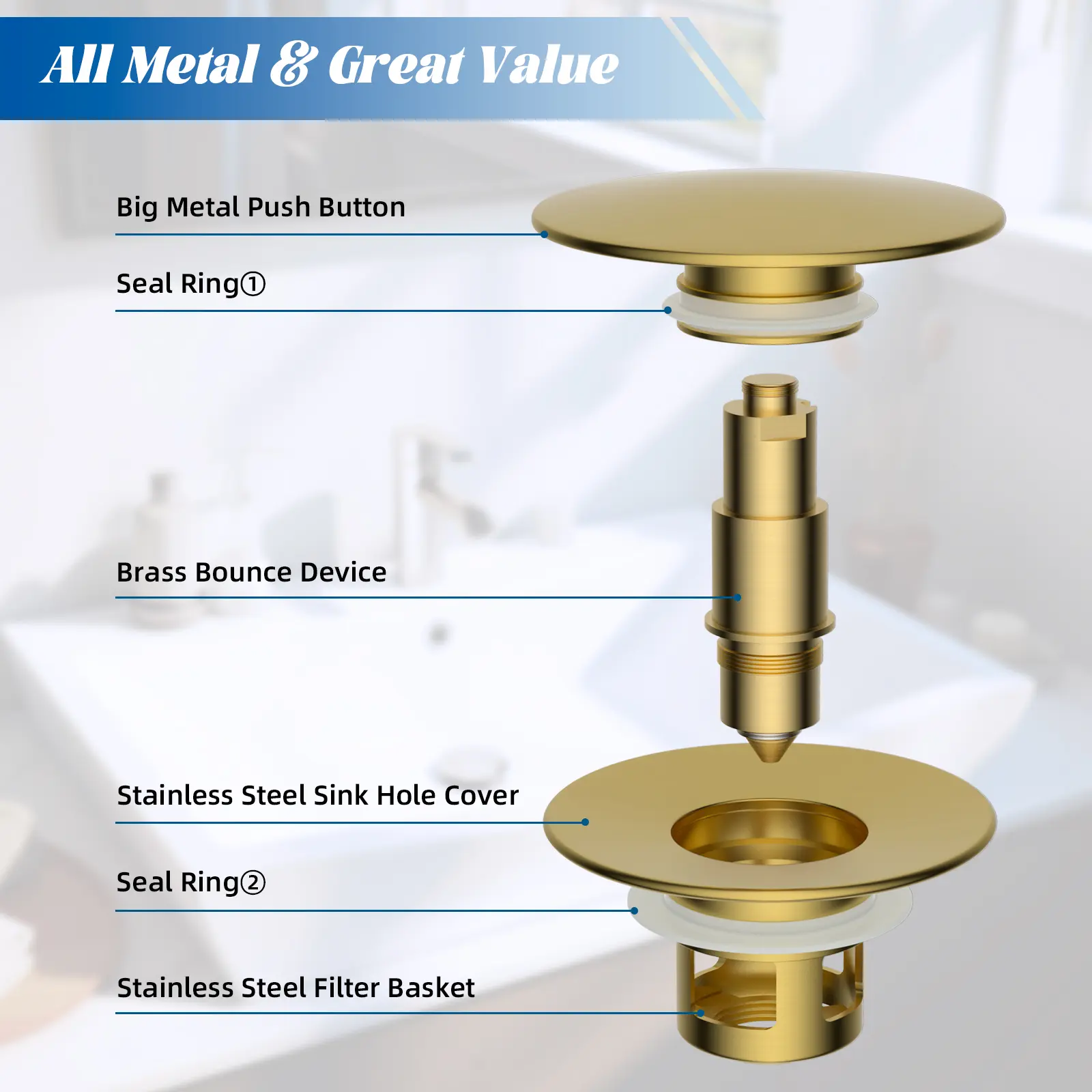 ·【Innovative Anti-Clogging Feature and Big Cap Design】 The upgraded pop-up bathroom sink drainer features enhanced sealing and anti-clogging capabilities. Its integrated basket effectively traps small items such as hair, jewellery, and other debris, preventing them from falling down the drain and causing blockages. The brushed gold-coated large cap offers an extended pressing area for easy operation and complements your bathroom decor beautifully
