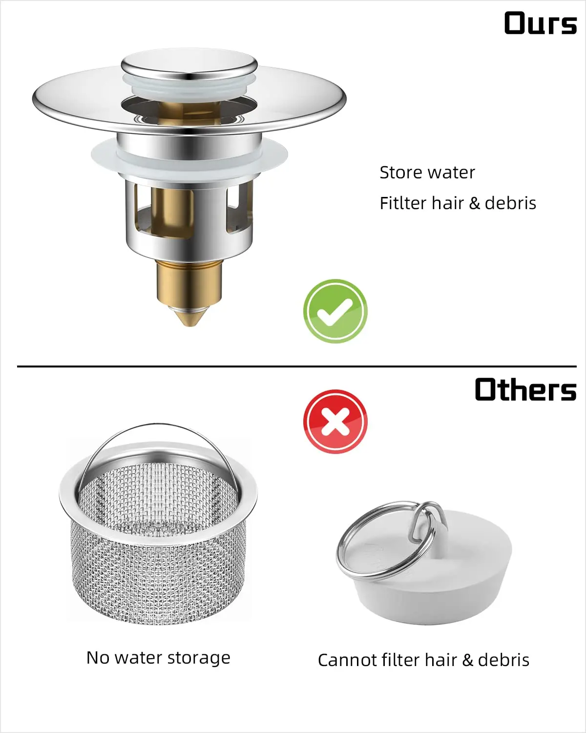 ·【Anti-clogging design】The pop-up bathroom sink drainer has a new upgrade on the regular push-button drain plug with sealing and anti-clogging feature. The sink strainer has an anti-clogging basket inside to prevent small objects such as hair, necklaces, rings from falling down the drain and causing clogs and damage to the system.