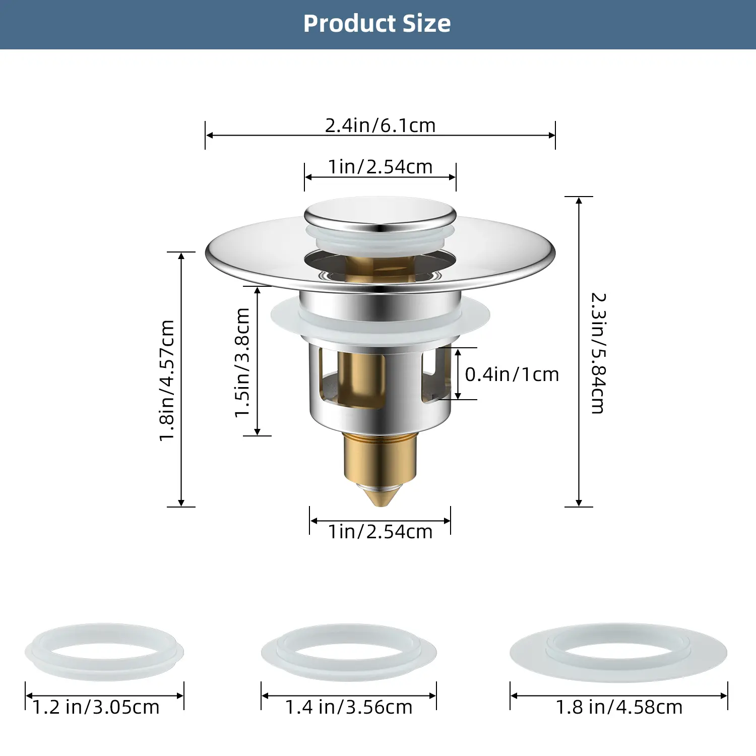 ·【Premium All Metal Material】Our pop up sink drain strainer is mainly made of high quality stainless steel material. It is corrosion resistant and durable. Bounce cap and hair catcher basket core are made of high-quality brass with chrome finish. Good rebound strength, quick seal and drainage with a single press. With 3 silicone seals for different size drain holes.