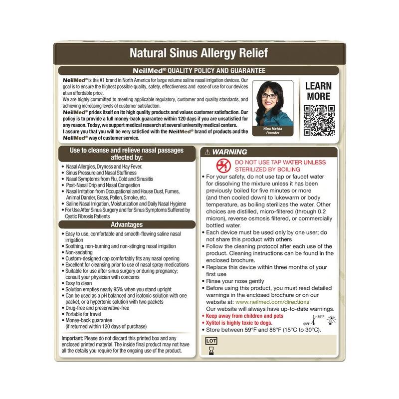 Always rinse your nasal passages with NeilMed® SINUS RINSE™ packets only. Our packets contain a mixture of USP grade sodium chloride and sodium bicarbonate. These ingredients are of the purest quality available to make the dry powder mixture. Rinsing your nasal passages with only plain water without our mixture will result in a severe burning sensation as the plain water is not physiologic for your nasal lining, even if it is appropriate for drinking. Additionally, for your safety, do not use tap or faucet water for dissolving the mixture unless it has been previously boiled for five minutes or more as boiling sterilizes the water. Other choices are distilled, micro-filtered (through 0.2 micron), commercially bottled or, as mentioned earlier, previously boiled water at lukewarm or body temperature. You can store boiled water in a clean container for seven days or more if refrigerated. Do not use non-chlorinated or non-ultra (0.2 micron) filtered well water unless it is boiled and then cooled to lukewarm or body temperature. Do not rinse if your nasal passages are completely blocked or if you have an ear infection or blocked ears. If you have had recent ear or sinus surgery, contact your physician prior to irrigation. If you experience any pressure in the ears or burning in the nasal passages, stop irrigation and get further directions from your physician. Keep out of reach of children. Read and retain this enclosed brochure for instructions and other important information.