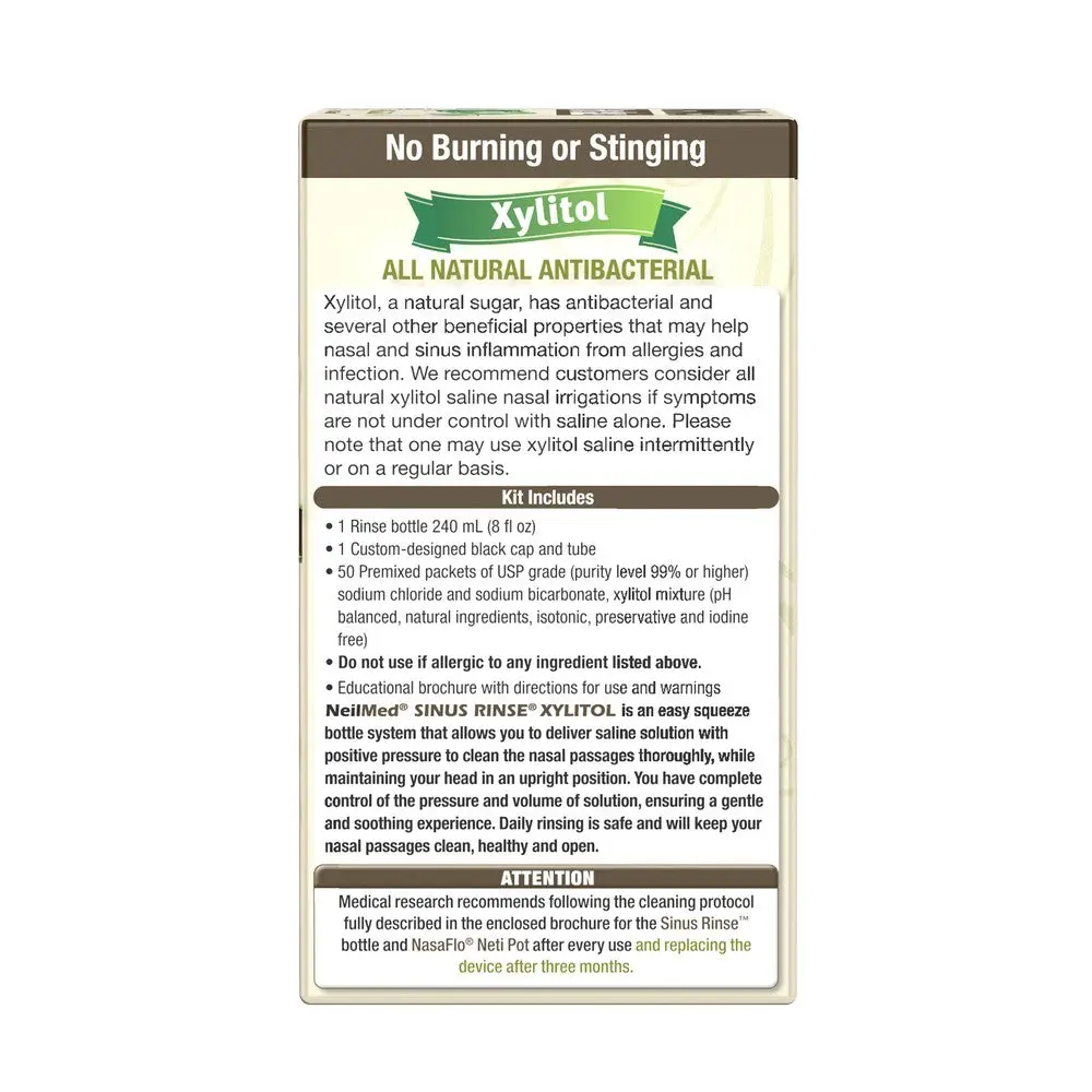 Xylitol, a natural sugar, has antibacterial and several other beneficial properties that may help nasal and sinus inflammation from allergies and infection. We recommend customers consider all natural xylitol saline nasal irrigations if symptoms are not under control with saline alone. Please note that one may use xylitol saline intermittently or on a regular basis.