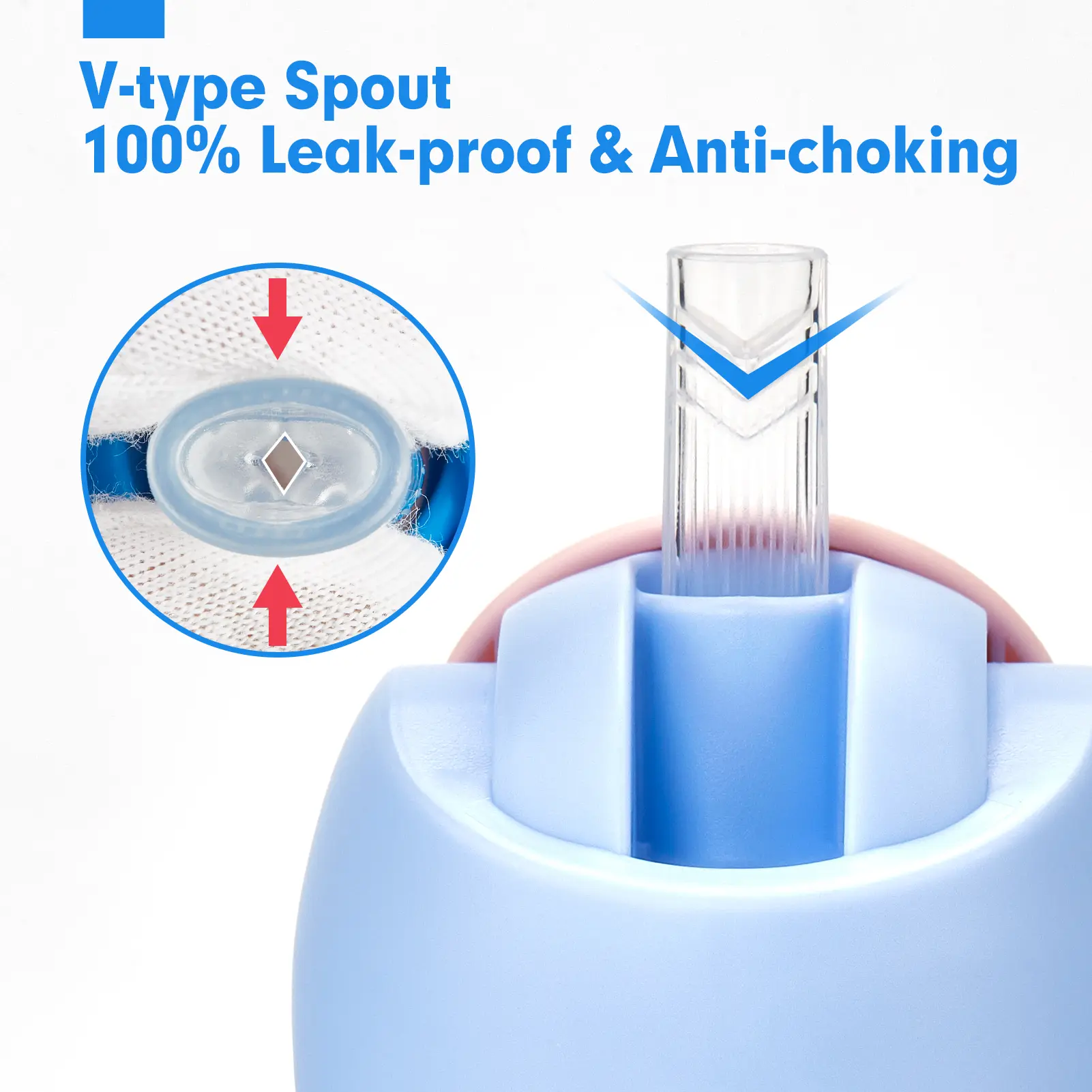 ·Leak-proof and Anti-choking: Compared to traditional drinking cups, our sippy cup is designed with V-type, valve cover and water seal ring, will form a sealed state and shut off the flow if the cup is dropped, effectively prevent leaks and avoiding mess, parents don’t need to worry for their kids choking. The spout also features a built-in air vent to help ensure your baby swallows liquid, not air. The cup includes a cap to help keep the spout clean when you’re on the go