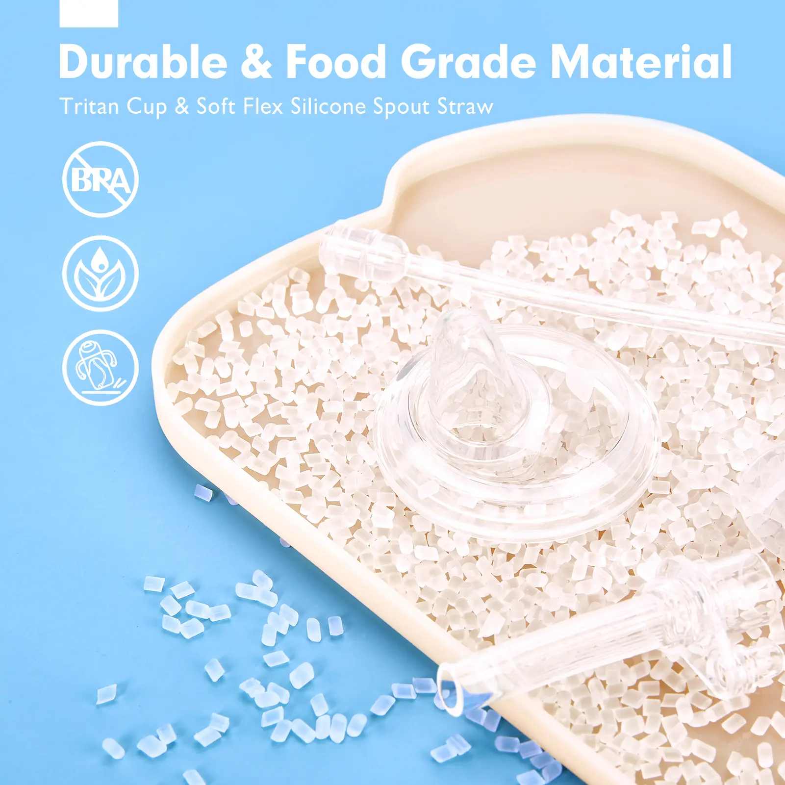 ·Food Grade Material and Healthy to Drink: The sippy cup is made of ultra-durable TRITAN material that is BPA-free, non-toxic, which is very healthy for the baby to use. Our toddler sippy cups are highly broken proof that can withstand being tossed from a high chair or stroller. Both spout and straw are made of food-grade soft flex silicone, which is proof to bite and pull, flexible and does not hurt the baby's mouth and emerging teeth, and will help the baby's gums growing