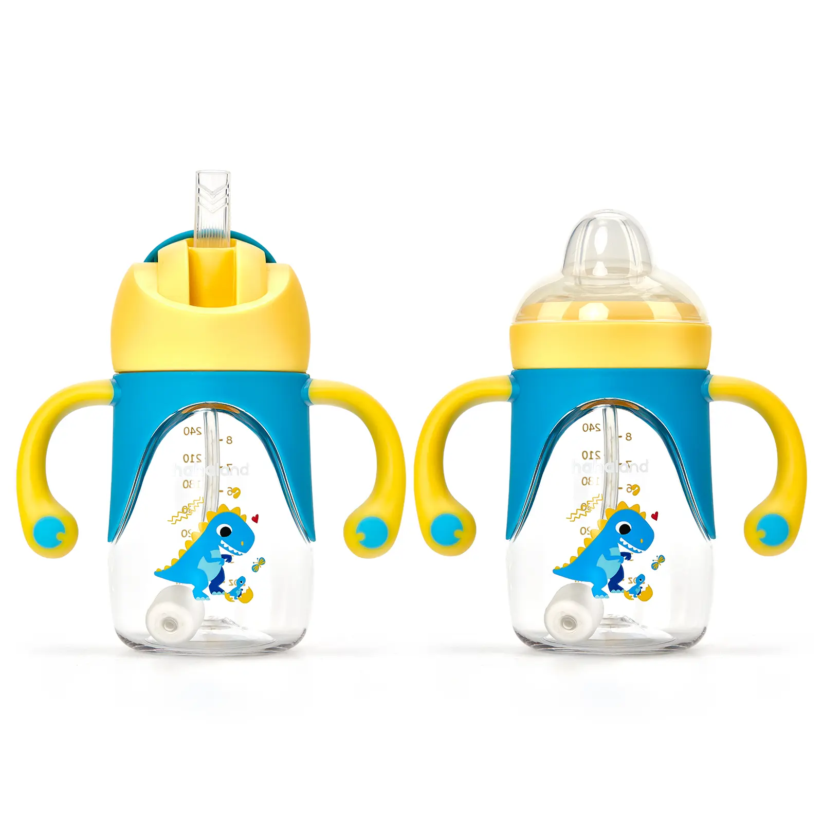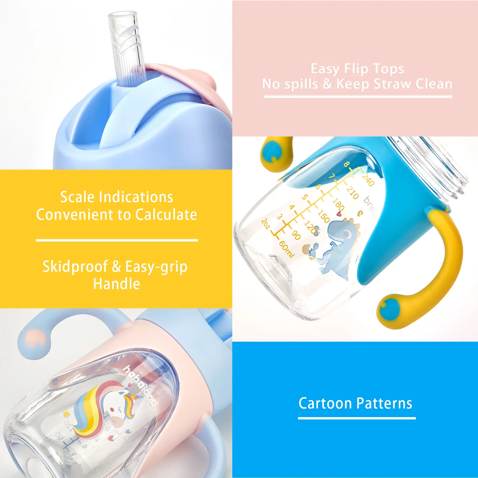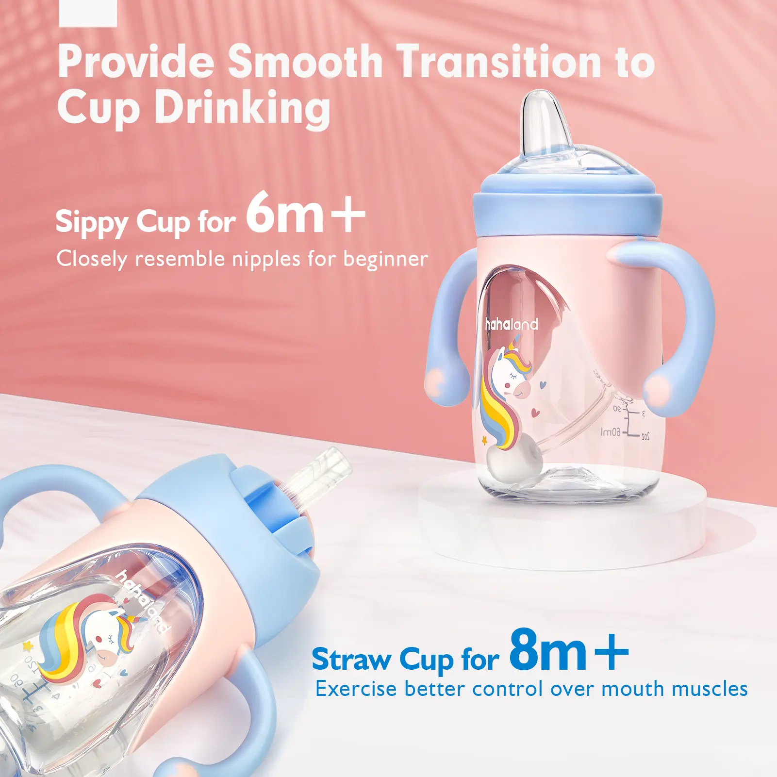 ·2-in-1 Sippy Cups Help Toddler Smooth Transition from Bottle to Cup: Making the transition from bottle or breast to a cup can be a challenge for the little ones. 2 types of pacifiers of cup is an ideal product to bridge this gap. The soft spout is similar to a pacifier, that beginners 6-12 months can learn sipping without resistance. The straw cups are suitable for 8 m+ babies to drink water while biting the valve, satisfy baby's biological emotional needs in oral stage and massage the gums