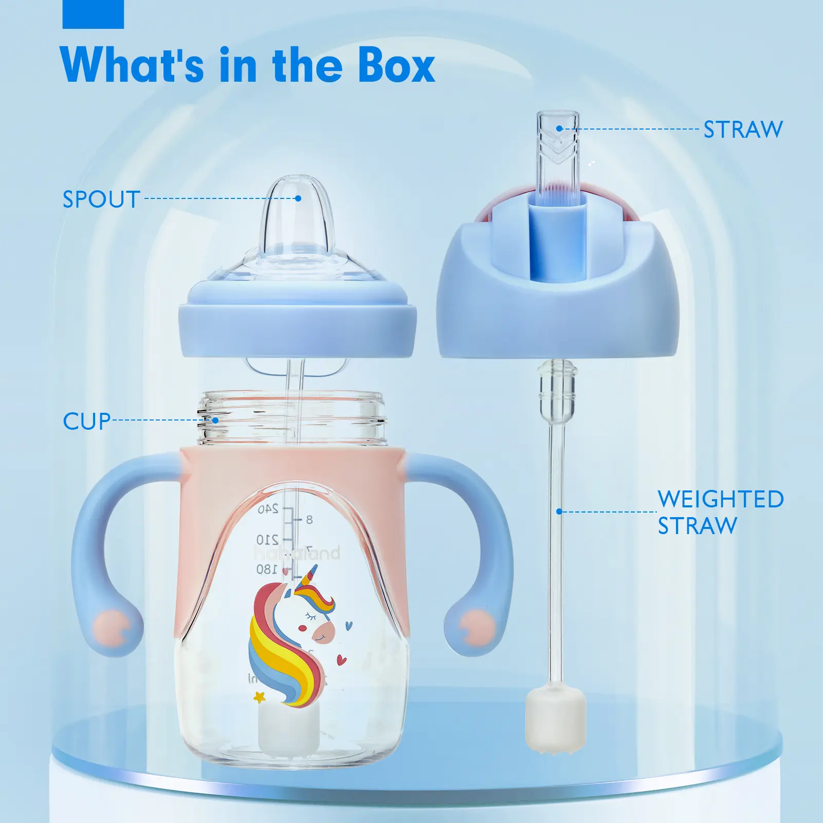 ·Weighted Straw, Ergonomic Handle and Scale Indications: The 360° weighted ball design of the detachable straw moves with the position of the water so that the baby can latch and feed in any comfortable position. The removable handle specifically designed for small hands, and to avoid dropping and spilling the liquid when training your baby’s muscle grip. The oz/ml scale indications help parents precisely control the amount of water and observe how much liquid the baby has consumed