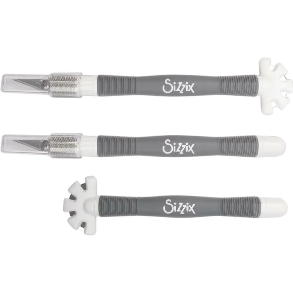 The right job demands the right tool. At the core of the Sizzix Multi-Tool Starter Kit is a dual-sided handle that supports a variety of interchangeable tool heads. (A closing cap is provided if only one tool head side is used.) This easy tool customization is what allows the Multi-Tool Starter Kit to be a potential all-in-one craft tool solution. The handle itself is ergonomically designed with easy-grip rubber on both ends for optimal use. In addition, the Starter Kit contains an interchangeable Craft Knife Head to trim, cut and remove paper from dies. (A Safety Cap is provided for when the tool is stored or not in use.) The Distressing Blade Head creates distressed paper edges for an elegantly-aged appearance.