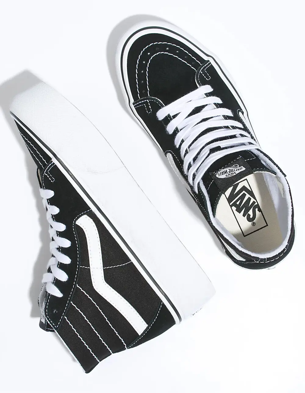 Vans Sk8-Hi Tapered Stackform Shoes. The Sk8-Hi Tapered Stackform refreshes our deconstructed high top silhouette with an even chunkier take on the platform aesthetic. Constructed with a 34 mm sidewall height, this platform shoe elevates a legendary favorite while bringing a new “Off The Wall” style to your look. Along with traditional suede and canvas uppers, the Sk8-Hi Tapered Stackform features a more slender and fitted silhouette than the traditional Sk8-Hi. It is finished with signature rubber waffle outsoles. Imported.