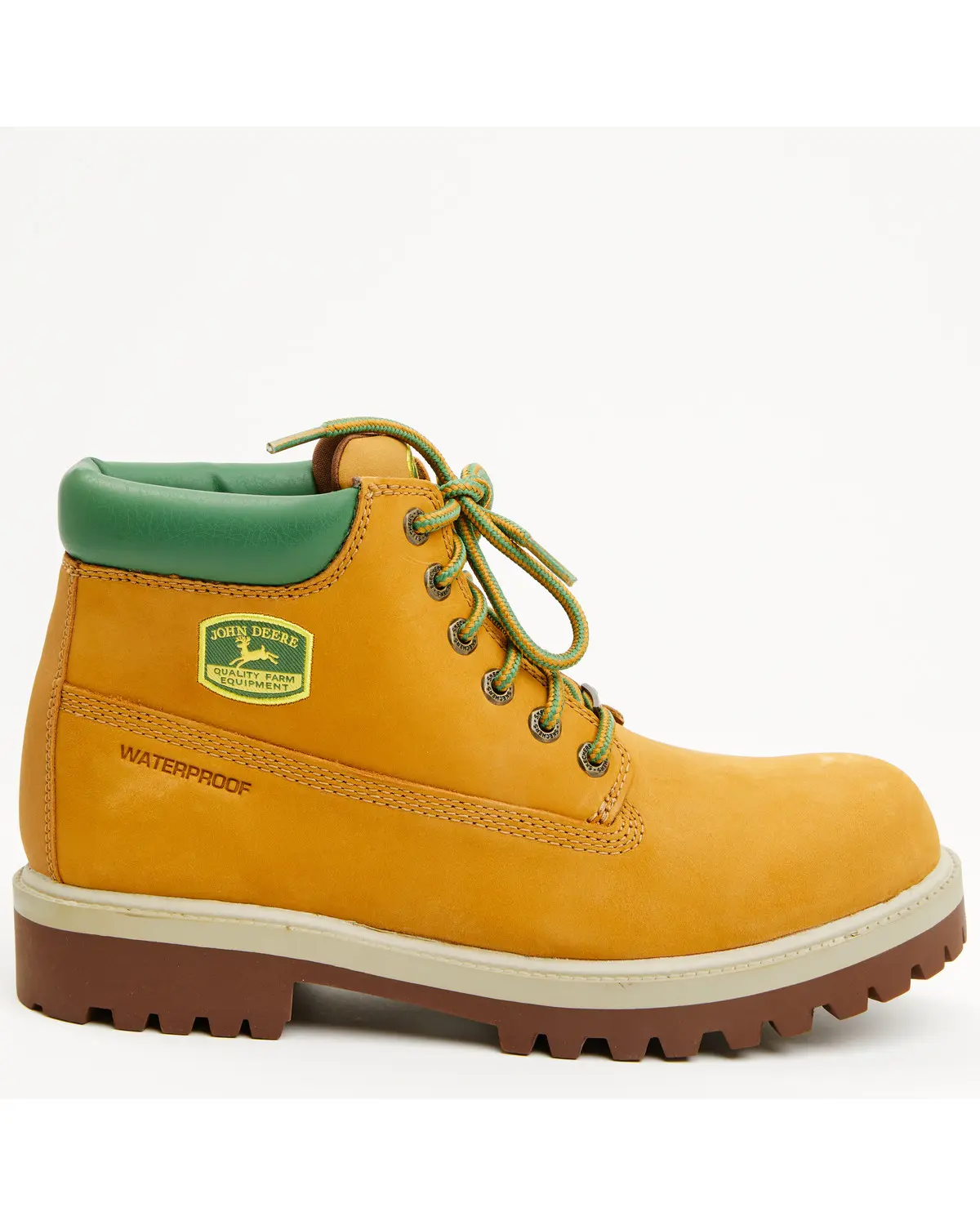Waterproof. Lace-up design. Leather upper. Padded collar. Round toe. 5 1/2" shaft height. 1" heel height. Solid tan design with green details. John Deere logo patch on left chest.