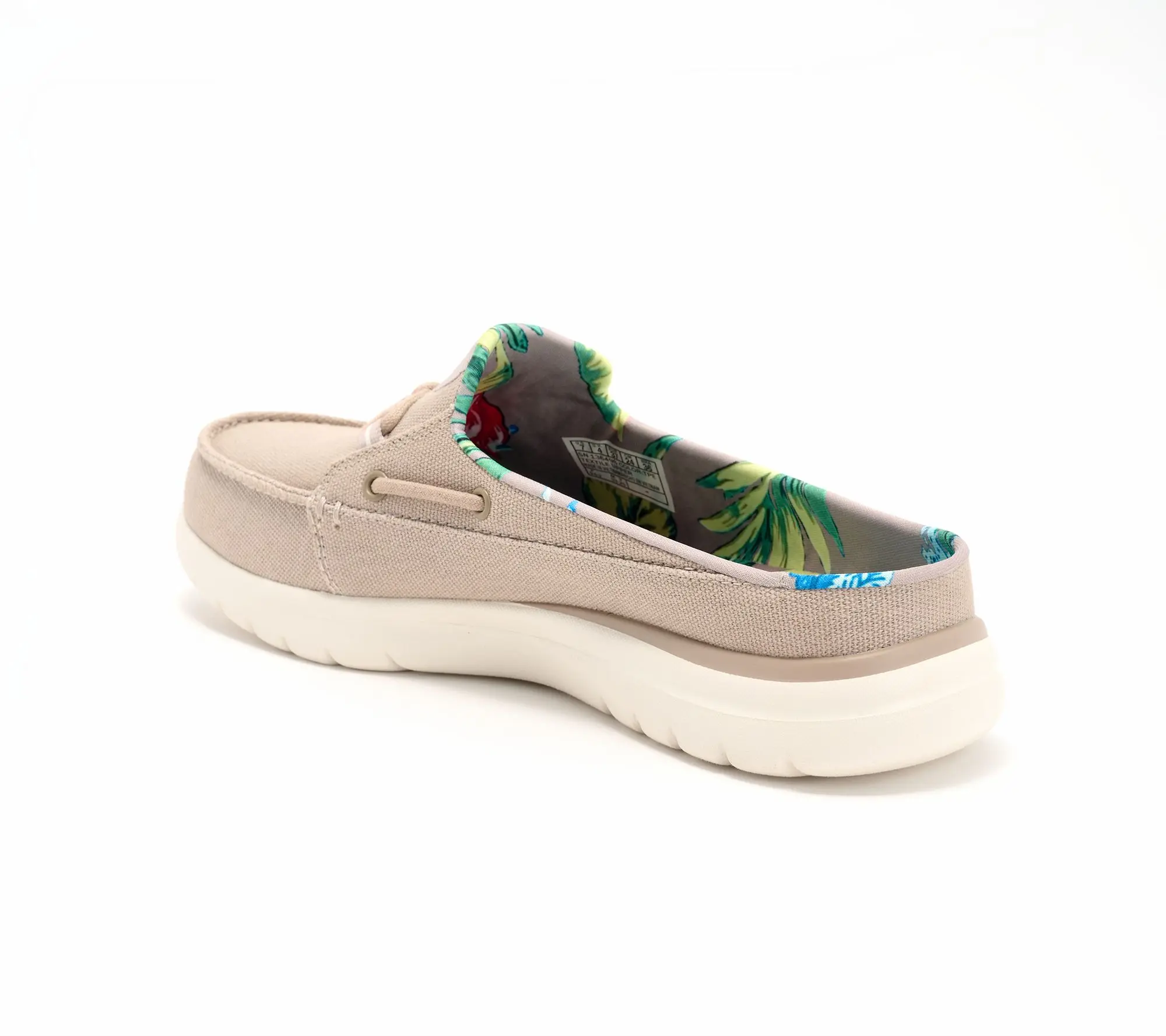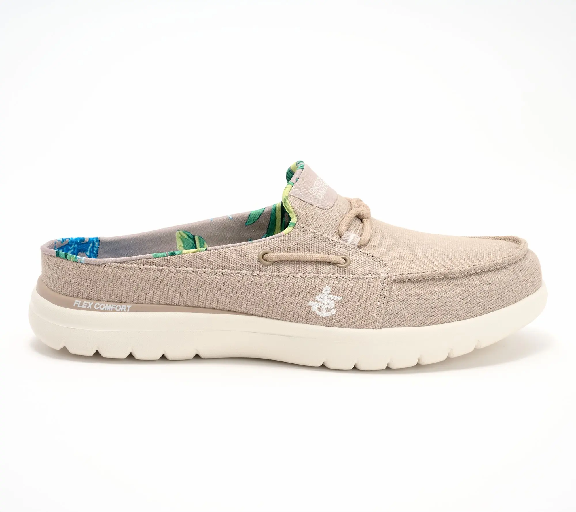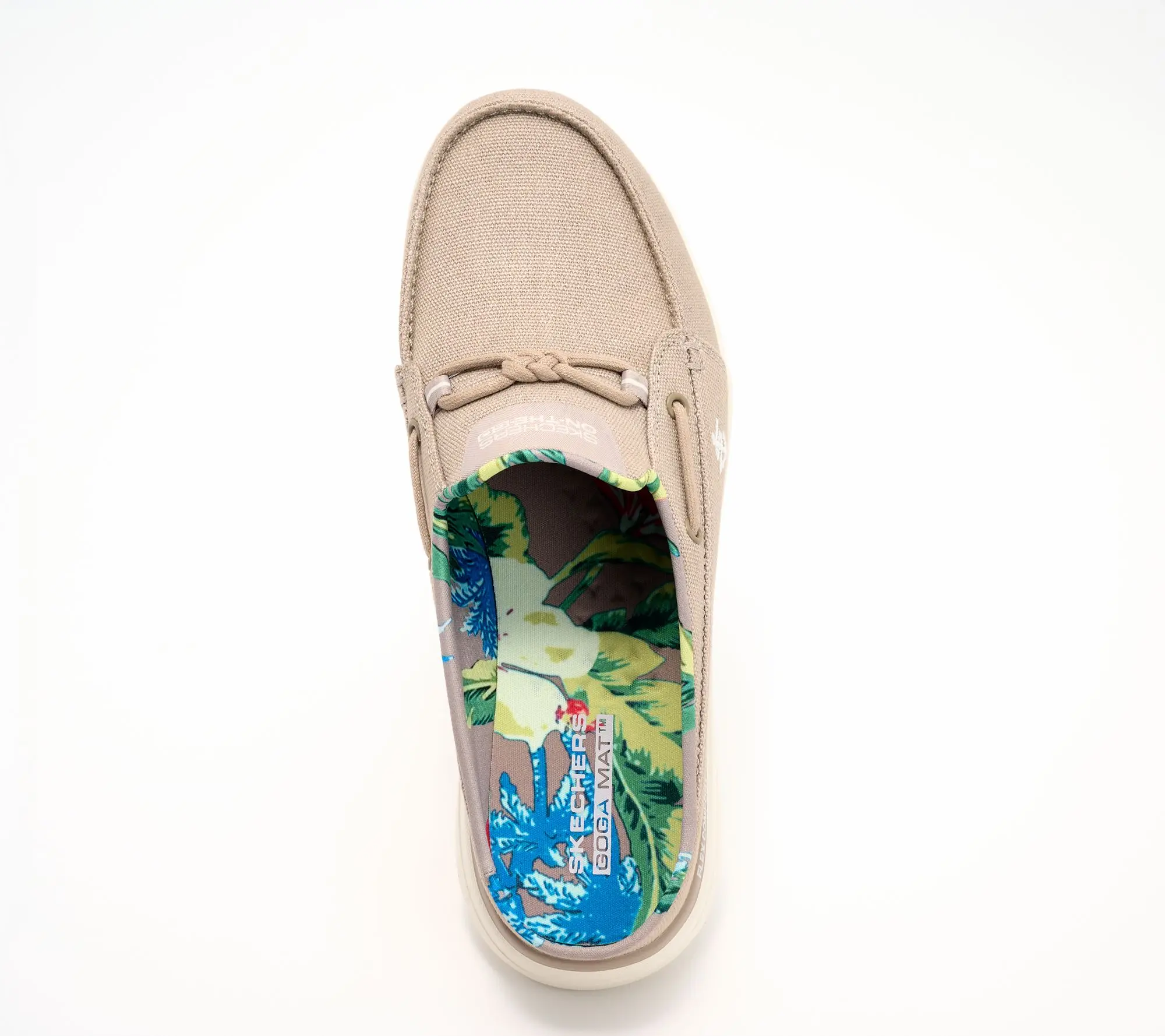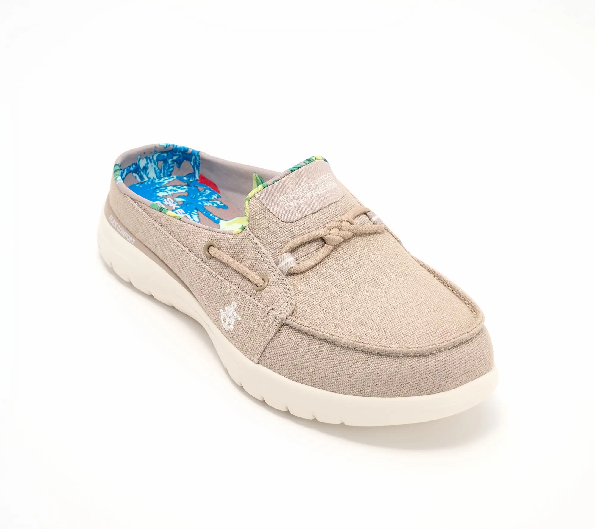 Skechers On-the-GO Flex Washable Canvas Mules - Saltwater. Flexible comfort and laid-back style combine in the Skechers On-the-GO Flex - Saltwater shoe. This open-back boat shoe features a soft canvas upper with a tropical print lining, Goga Mat- insole and a lightweight ULTRA GO cushioned midsole. Content: textile upper; balance manmade. Sole thickness: 1". Fit: true to size. COO: Imported.