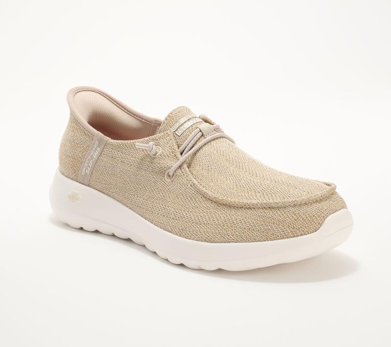 Skechers Slip-ins GO WALK Joy Moc Toe Shoes - Fantasia. Step up your routine with easygoing comfort wearing Skechers Slip-ins : GO WALK Joy - Fantasia. Designed with our exclusive Heel Pillow, this laced slip-on style features a metallic knit upper with a cushioned Skechers Memory Foam insole and lightweight 5-GEN cushioning. Content: textile & man made upper, balance man made. Sole thickness: 1 3/8". Fit: true to size. COO: Imported. See blueprint for claims.