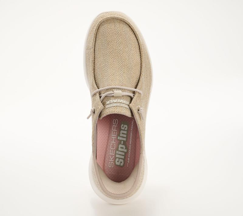 Skechers slip-in shoes with cushioned memory foam and a true-to-size fit. Hands-free, comfortable, and easy for everyday wear. Neutral shimmer color plus navy and gray options. #skechers #slipinshoes #comfortshoes #everydaystyle #qvc