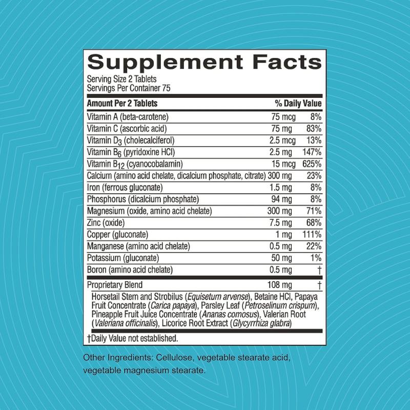 IngredientsContains vitamin C, vitamin B6, vitamin B12. Also contains vitamin A, vitamin D, calcium, iron, phosphorus, magnesium, zinc, copper, manganese, potassium, boron, horsetail stems, betaine HCl, papaya fruit, parsley leaves, pineapple fruit, valerian root and licorice root concentrate.