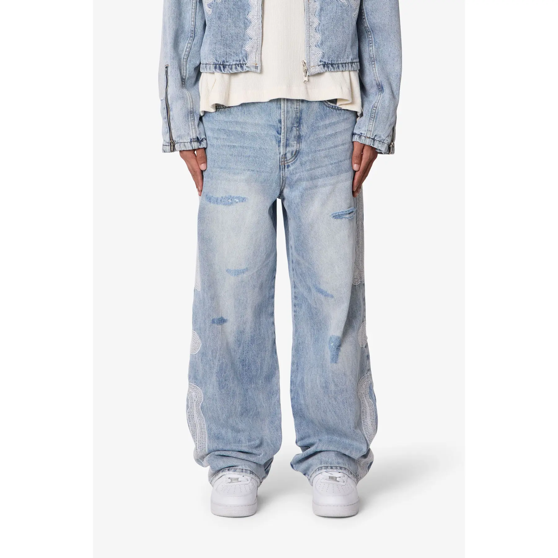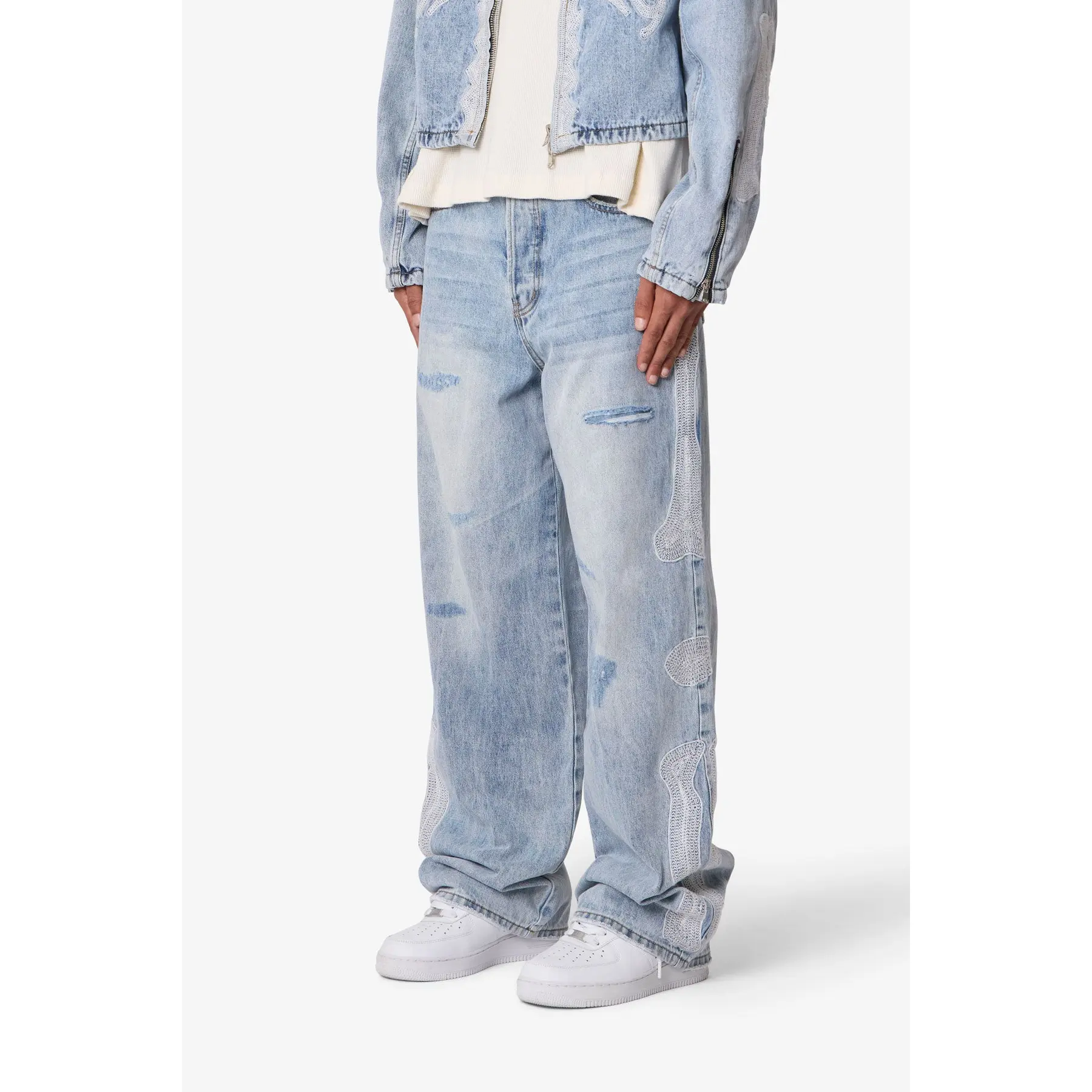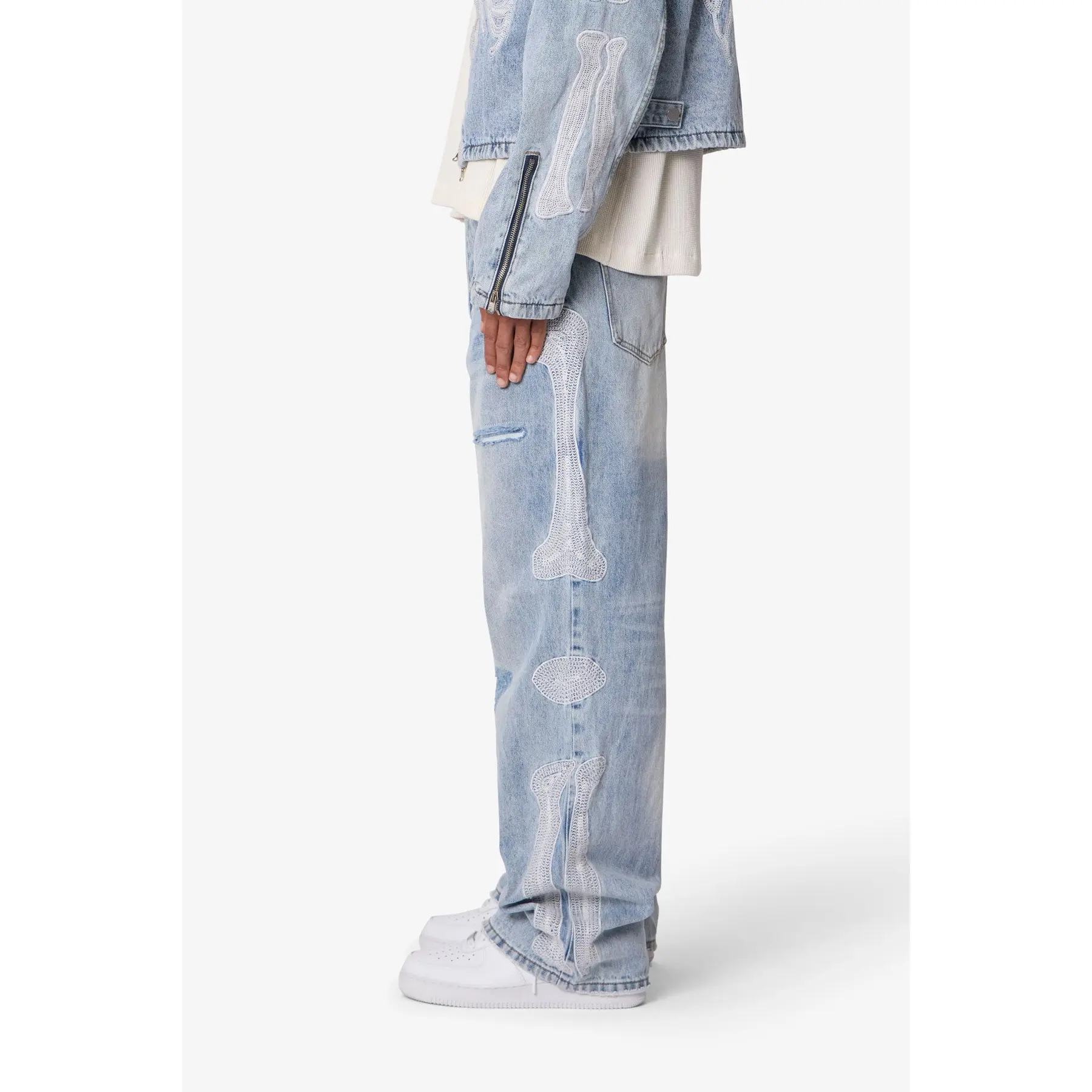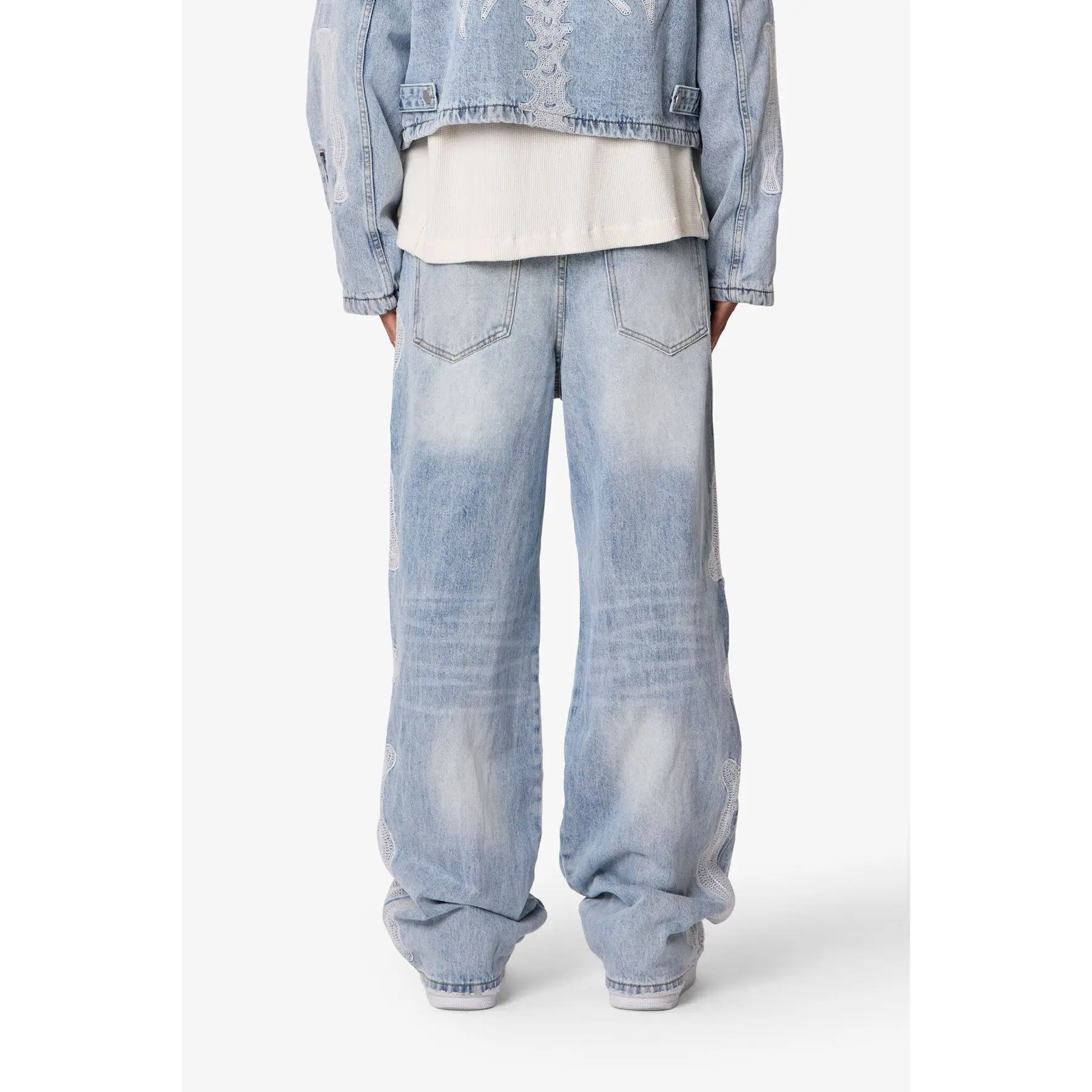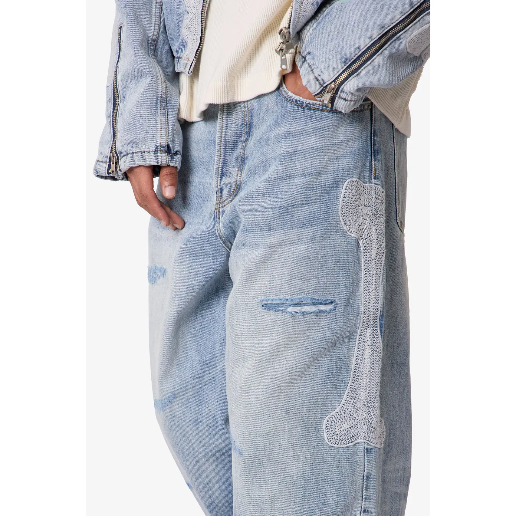 The Skeleton Ultra Baggy Denim is constructed from a cotton-poly blend with a washed finish. Designed with an ultra baggy fit, the denim features chain stitch skeleton patch appliques, light sanding, whiskering, and distressed patch details throughout. Finished with standard five-pocket styling, a button fly, and belt loops.