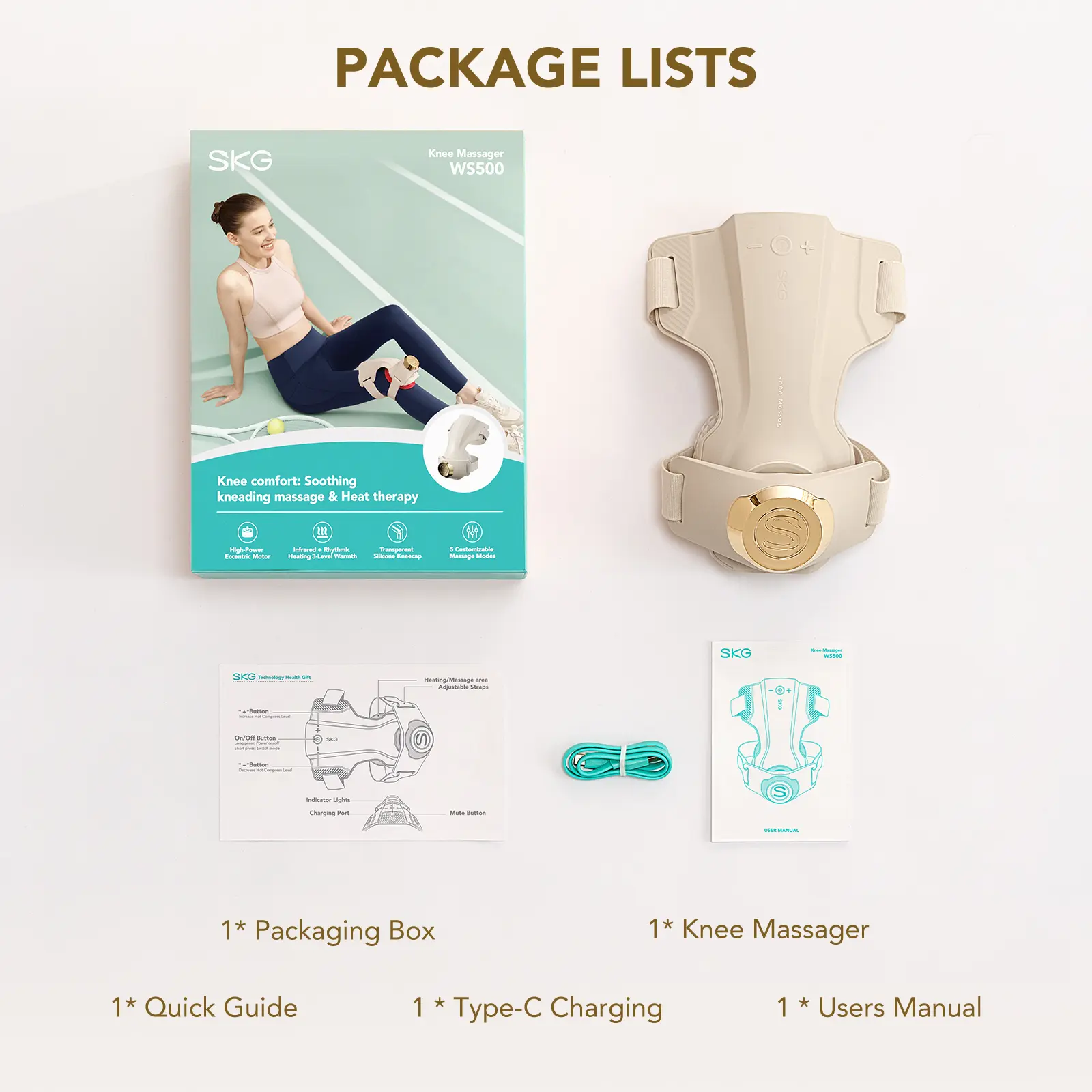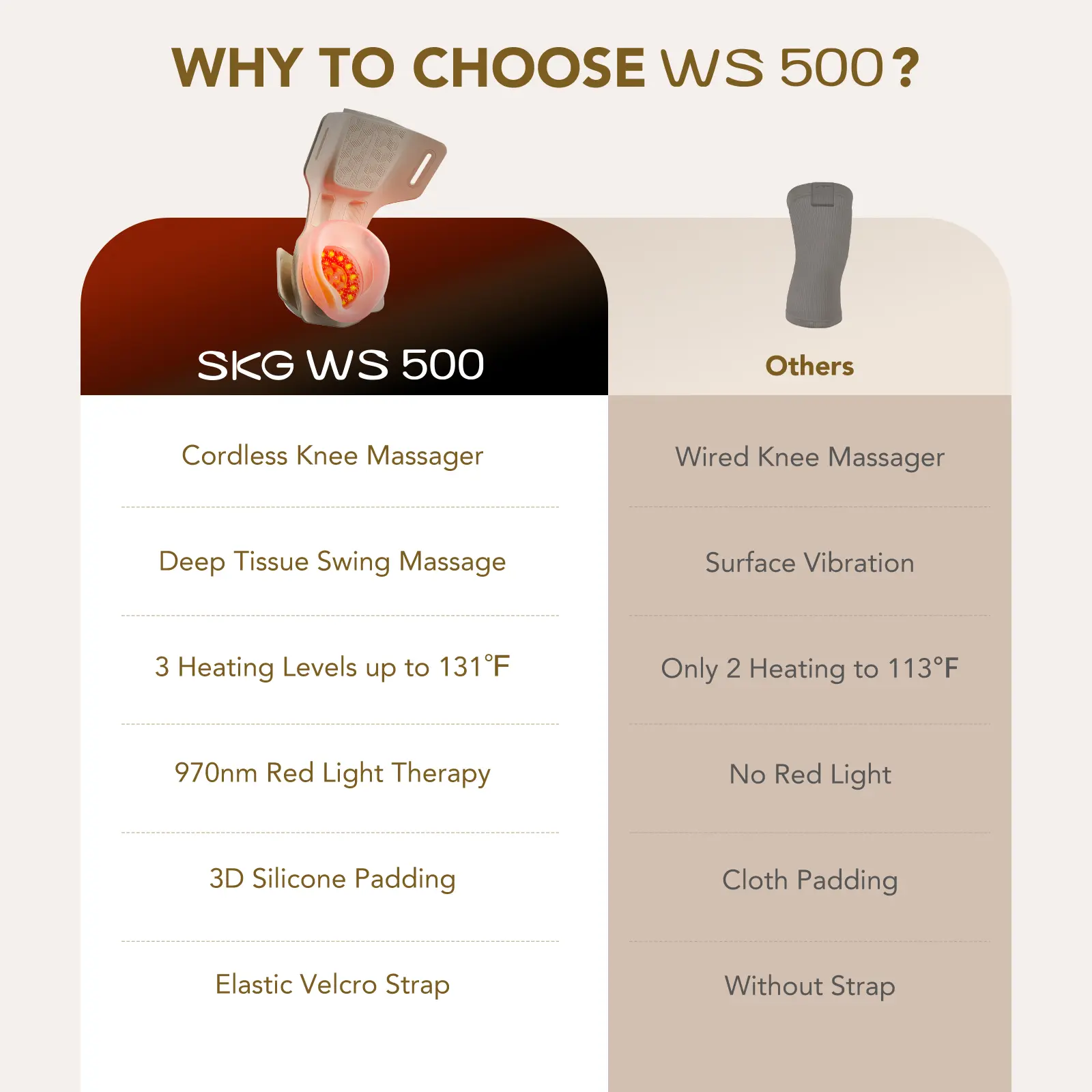 ·【5 Intensities for Knee Comfort】Powered by an advanced eccentric motor system, SKG WS500 knee massager recreates the feel of real-hand massage with 20 mixed-size paw-shaped nodes. Dual 9cm kneading plates deliver dynamic 3D motions to ease stiffness and soothe tired knees. Choose from 5 adjustable modes to enjoy daily relaxation, support flexibility, and refresh your knees after activity.