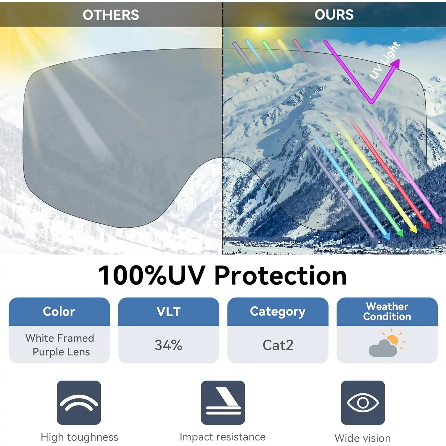 ·【100% UV400 PROTACTION】- The snowboard goggles with 100% UV400 protection coat allow you to see the terrain without distortion in any light condition while also protecting your eyes from glare and harmful UV rays.