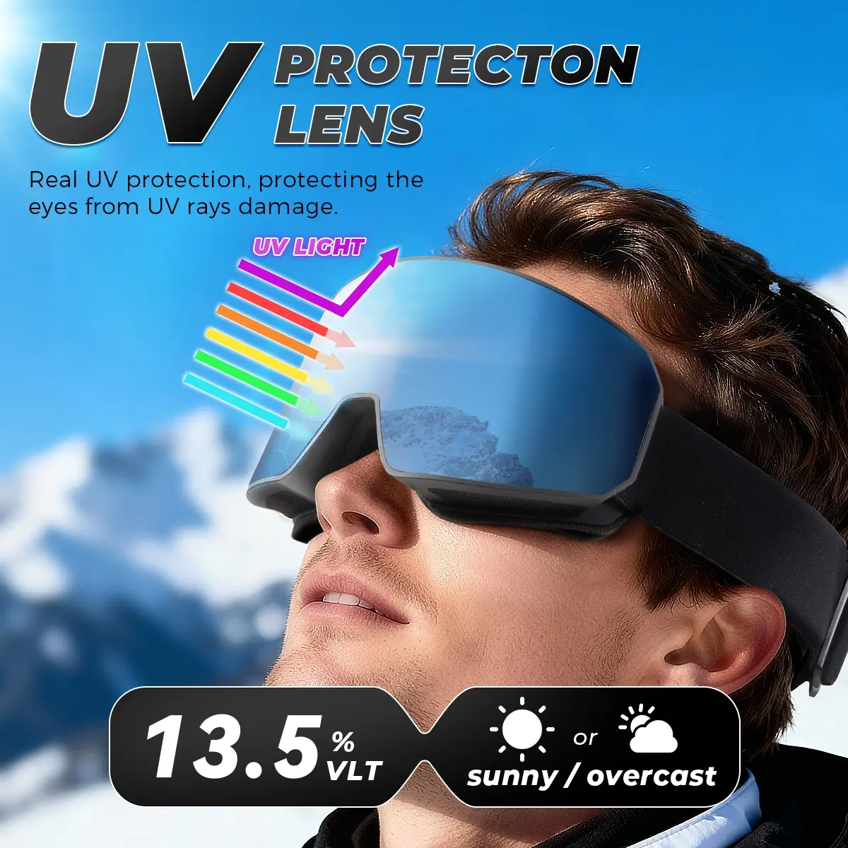 1.UV400 Protection – Blocks 100% of harmful UVA and UVB rays to keep your eyes safe on sunny slopes.