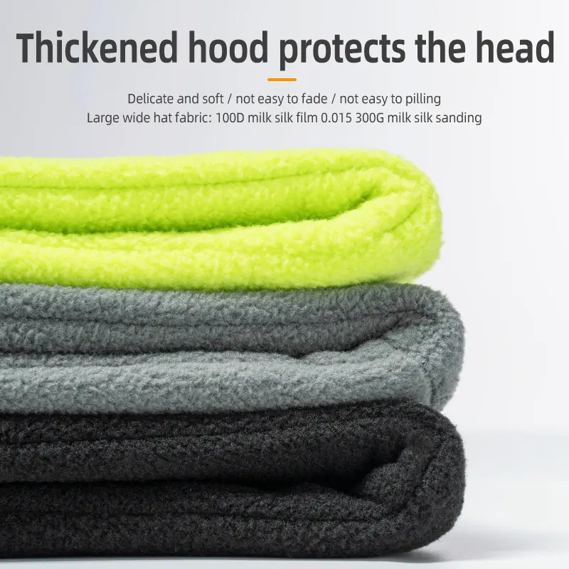 The ski mask features a double-layer hood design. The inside fabric is polar fleece, skin-friendly, and warm. The outer layer is water-resistant, ensuring you stay dry and warm. The drawstring allows for adjustable tightness, providing a snug fit. The breathable material ensures comfortable wear during extended outdoor activities.