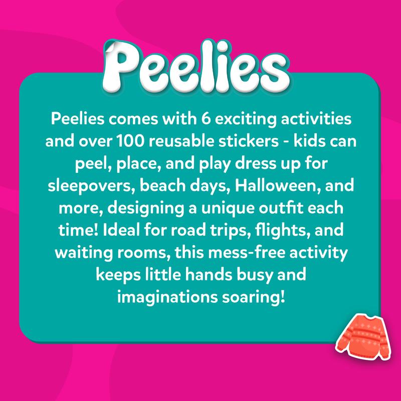 ·REUSABLE STICKER ACTIVITY BOOK: Skillmatics Peelies features 6 fun-filled activities and 100+ reusable stickers! Kids can peel, place, and play dress up for sleepovers, beach days, Halloween, and more, designing a new look each time they play.