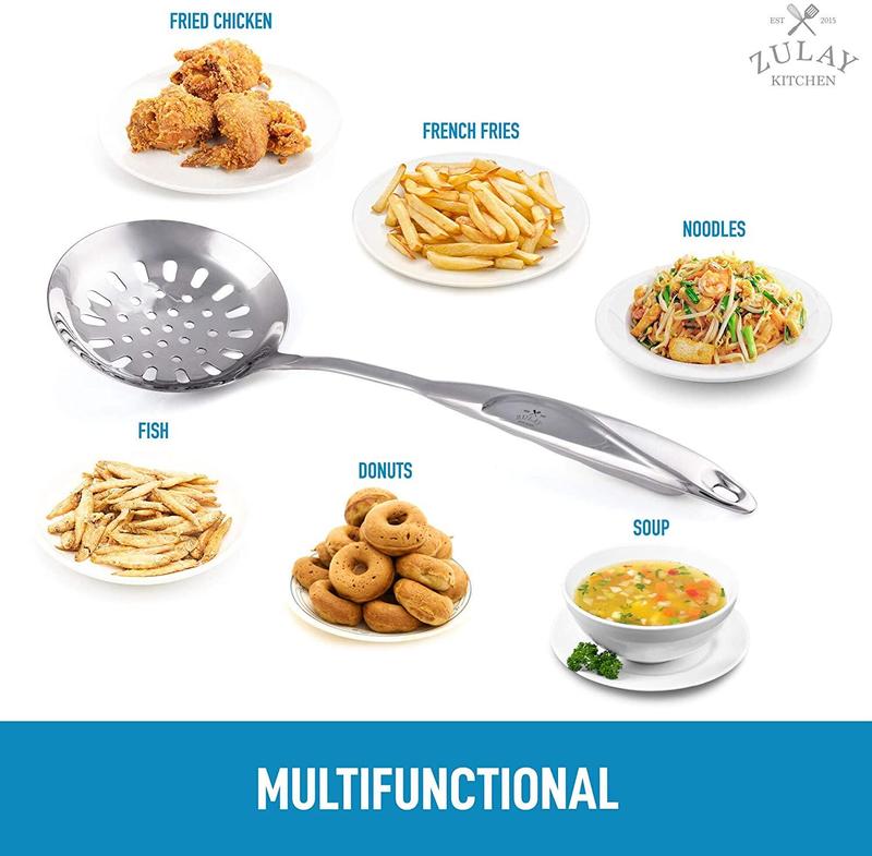 The Zulay Kitchen 14.5-Inch Draining Spoon is crafted from premium food-grade 201 stainless steel with a mirror finish. Designed to withstand years of constant use, it can handle even the hottest temperatures, making it perfect for deep frying and boiling liquids without rusting or corroding.