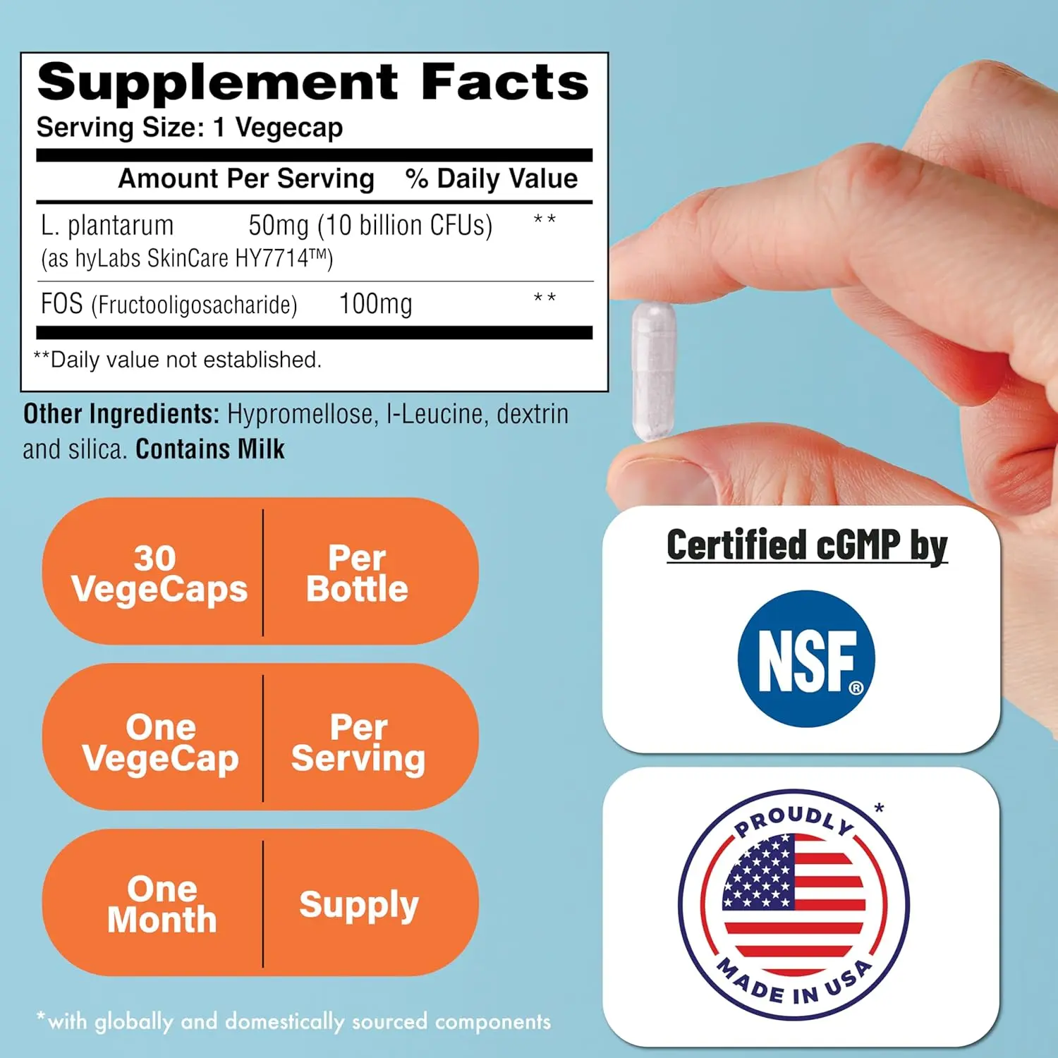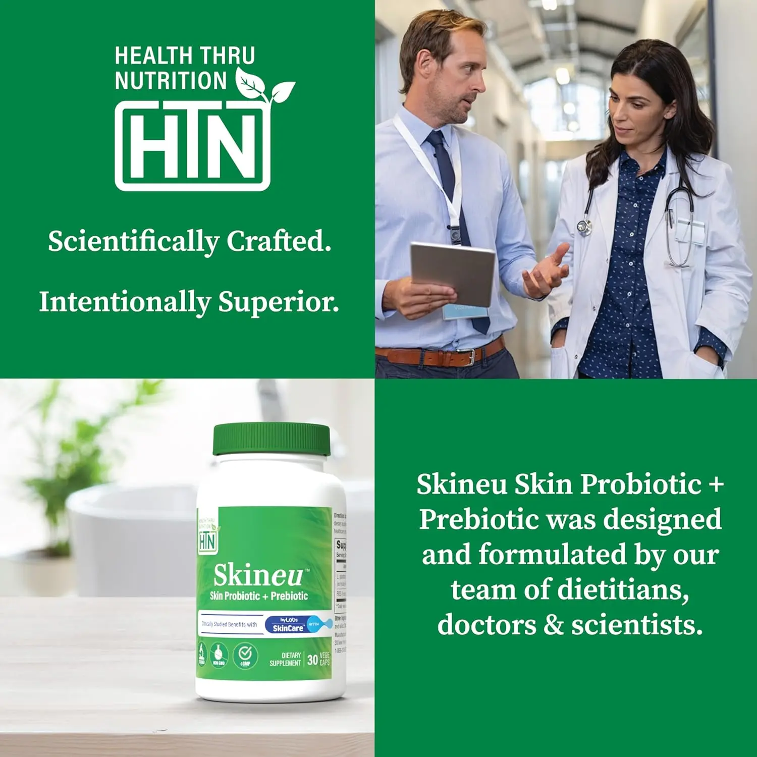 Made in the USA in a cGMP certified facility, Skineu™ Skin Probiotic + Prebiotic provides a natural and simple way to support your skin health through its unique blend of probiotics and prebiotics. As always, consult with your healthcare provider before starting any new supplement regimen.