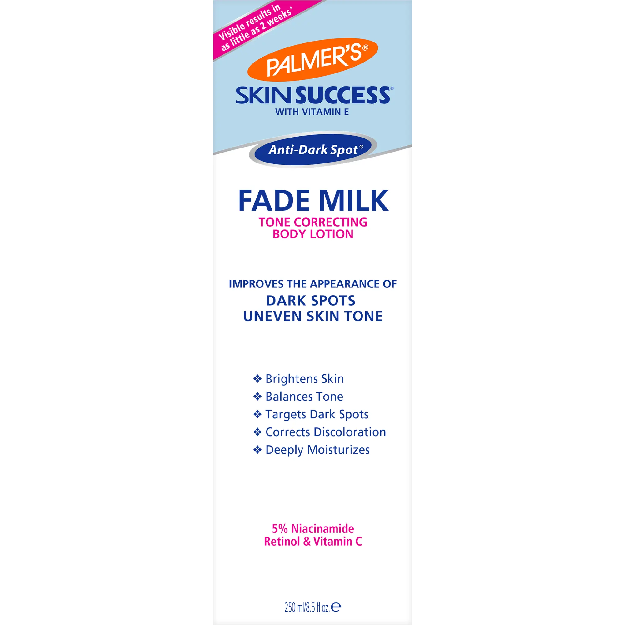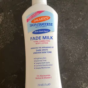 Palmer's Skin Success Fade Milk gives you a flawlessly radiant body by effectively correcting discoloration on pigment-prone areas of the body such as arms, legs, knees, elbows and decolletage.