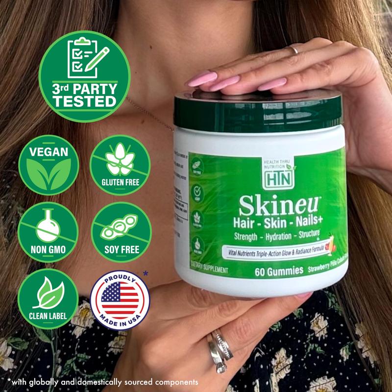Skineu Hair, Skin & Nails+ Gummies offer a high-quality blend of Biotin, Low Molecular Weight Hyaluronic Acid, and Retinyl Palmitate in a delicious Strawberry Pina Colada flavor. This advanced formula is designed for those seeking a nutrient boost to complement their daily routine.
