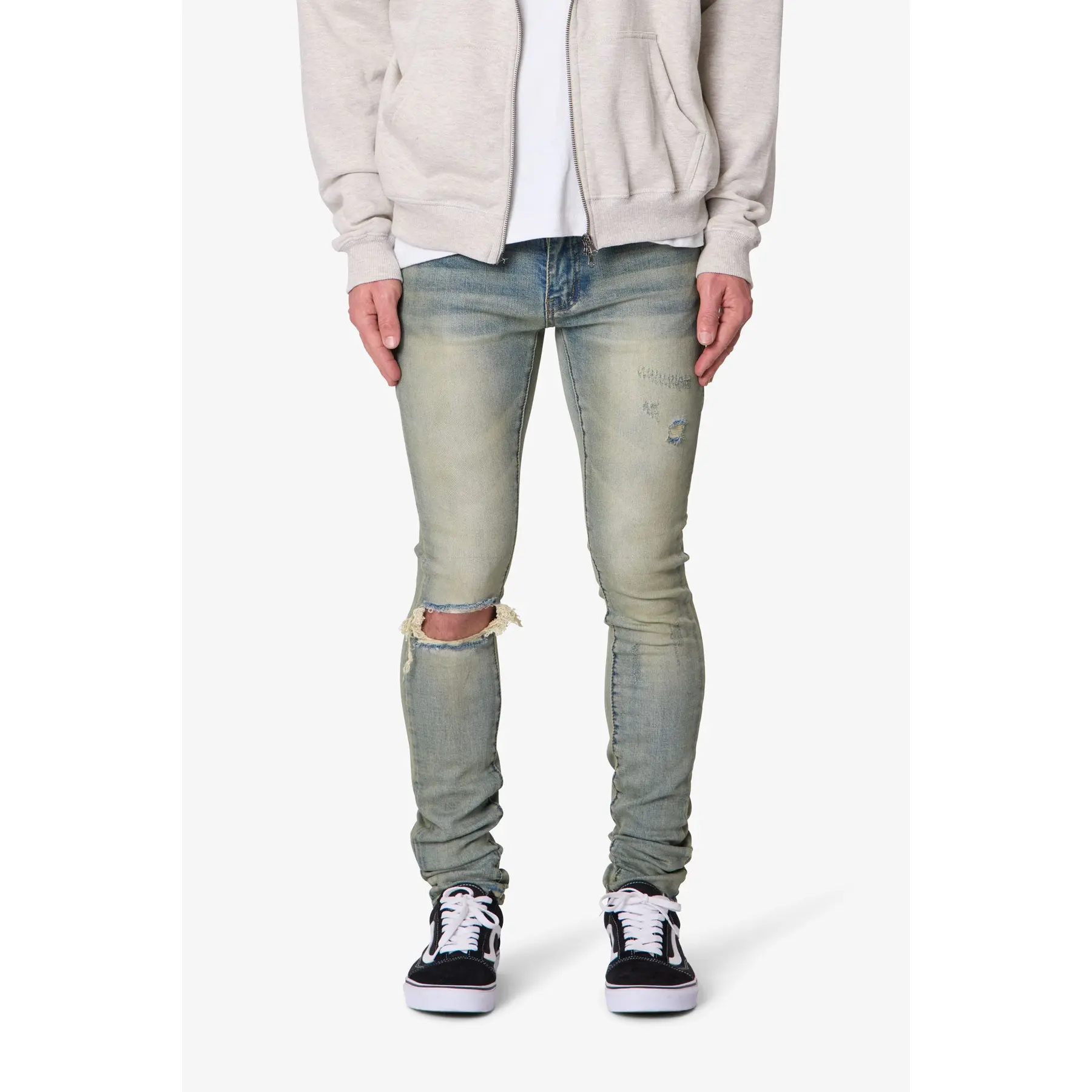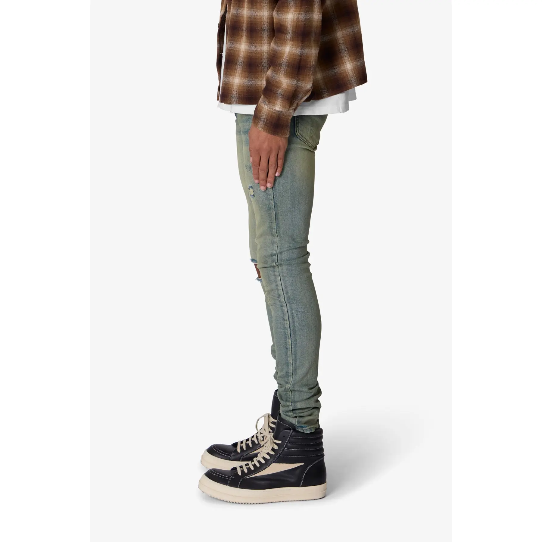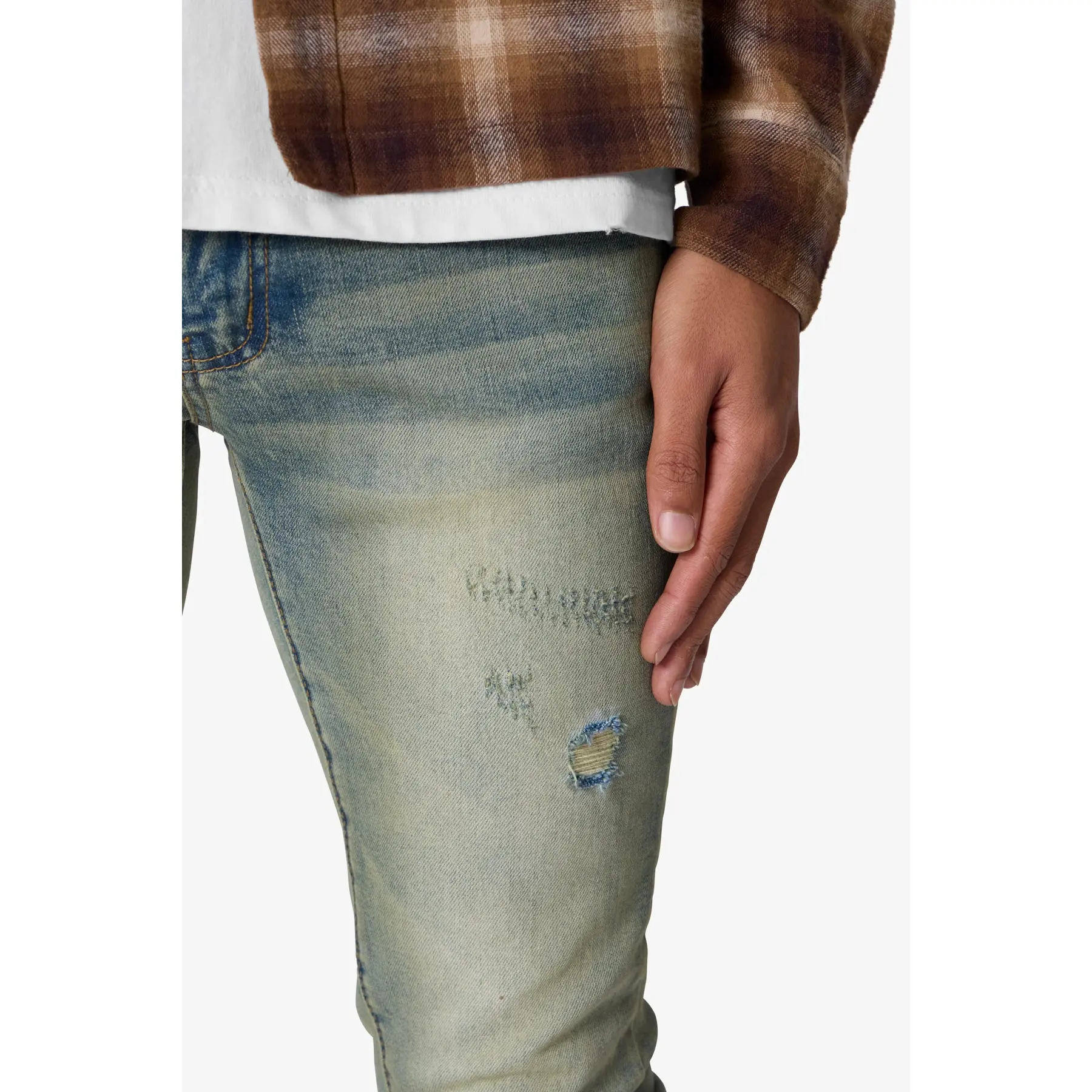the X721 Dusted Skinny Denim is designed with our new X fit which is skinny throughout with an extended inseam for stacking, and features a vintage blue wash and custom distressing at the knees.