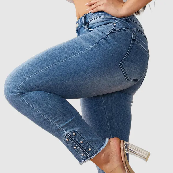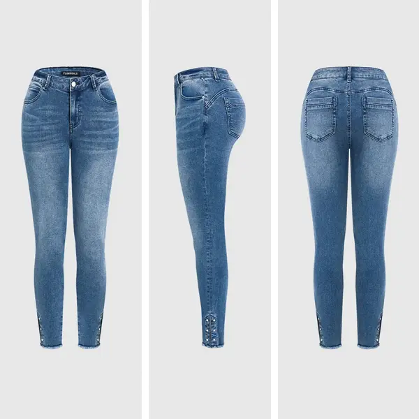 Flamingals High Waist Skinny Jeans Stretchy BBL Fit Raw Hem Pearl Detail Denim Pants Women’s Fashion Casual Comfort All Seasons Hip Pocket