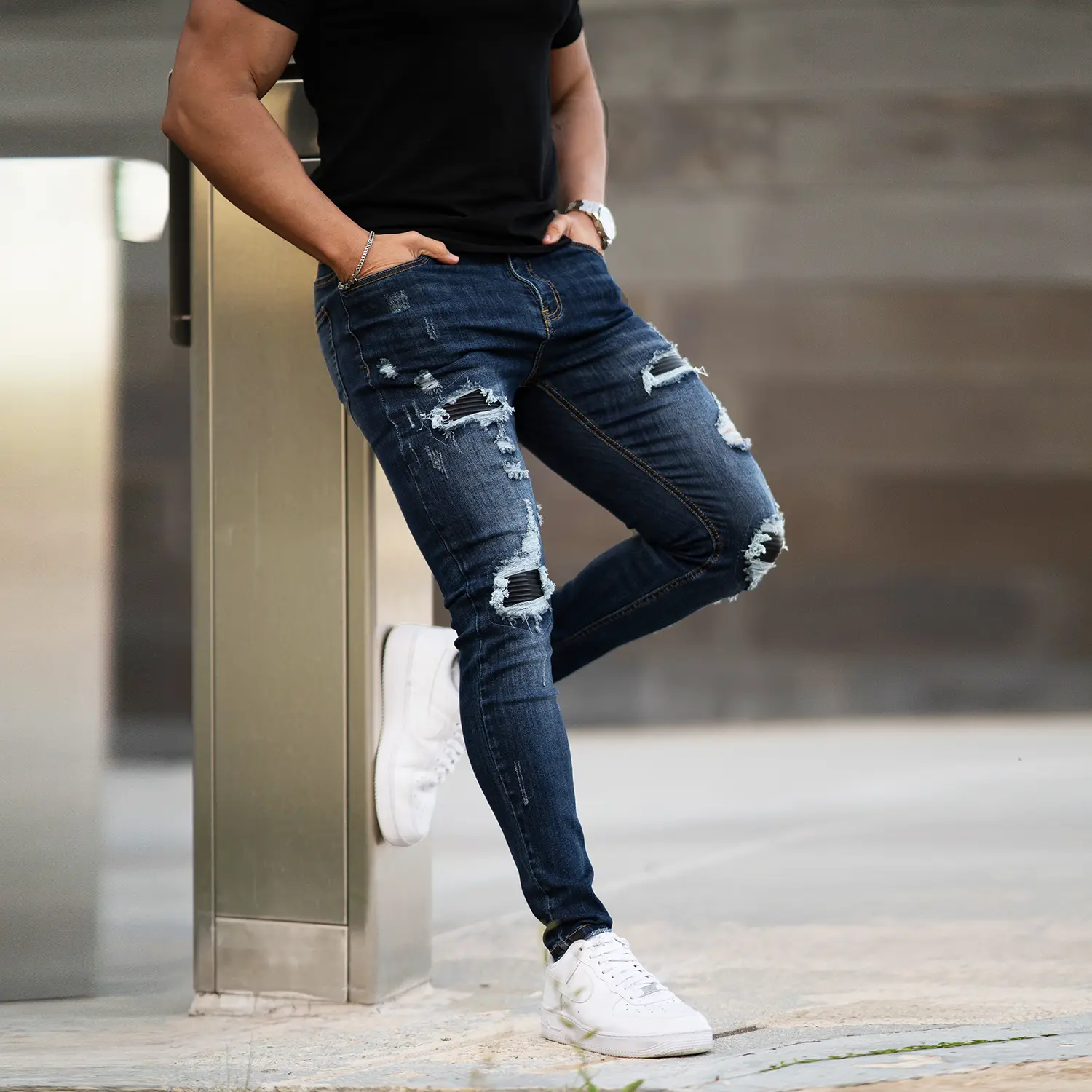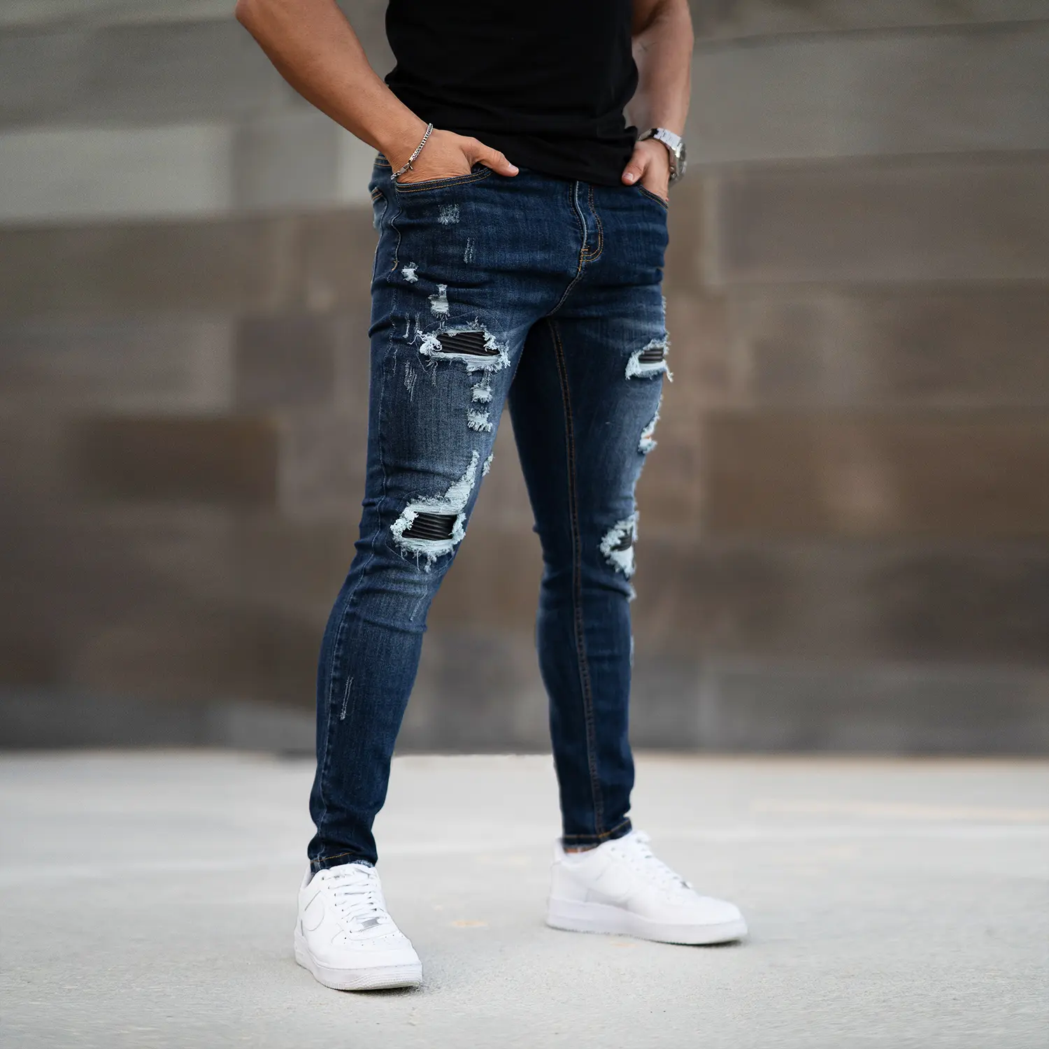 ·Ripped distressed jeans pants originating from senior fashion design, Fully meet mainstream trend.You will be more charming with our slim fit jeans in the workplace and leisure place.leather fabric patchwork is designed to be used in worn areas to make you stand out from the crowd.