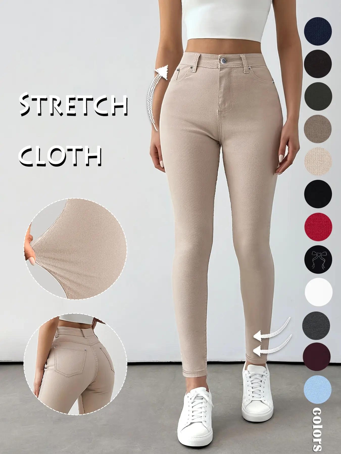 Women's Button-Fly Skinny Pants with Pockets, Casual, Comfy Pants for Daily Wear, Ladies' Bottoms for All Seasons (One Size Up is Recommended)